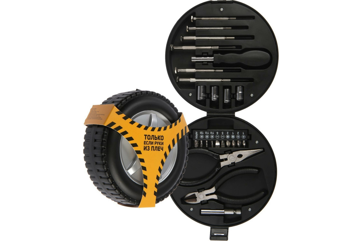 Набор инструментов TUNDRA, подарочный пластиковый кейс "Колесо", 24 предмета 7379041 представляет собой универсальный комплект, который можно использовать в широком спектре сфер деятельности. Имеется самое необходимое, для проведения ремонтных работ. Набор пригодится в быту, его также можно перевозить в автомобиле.