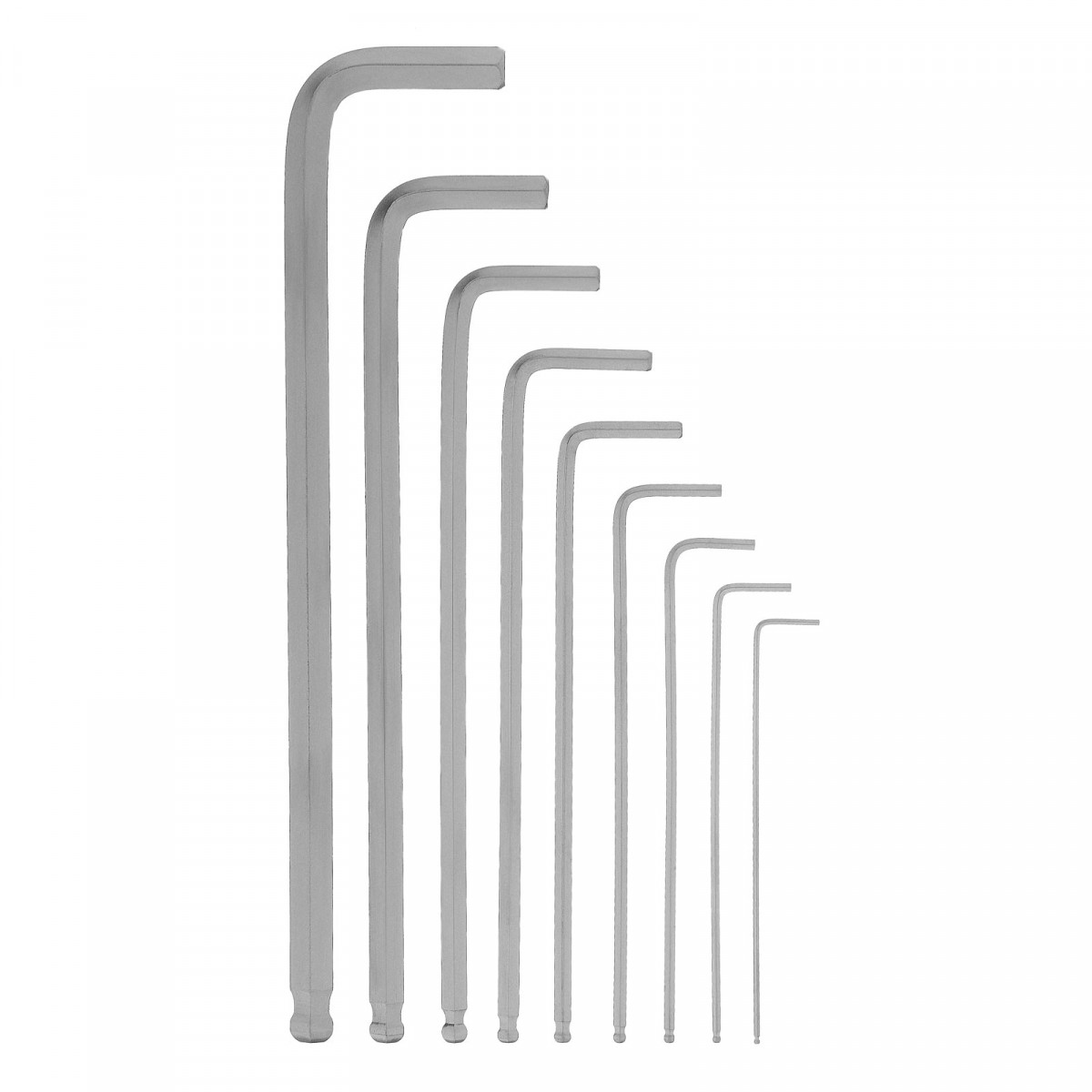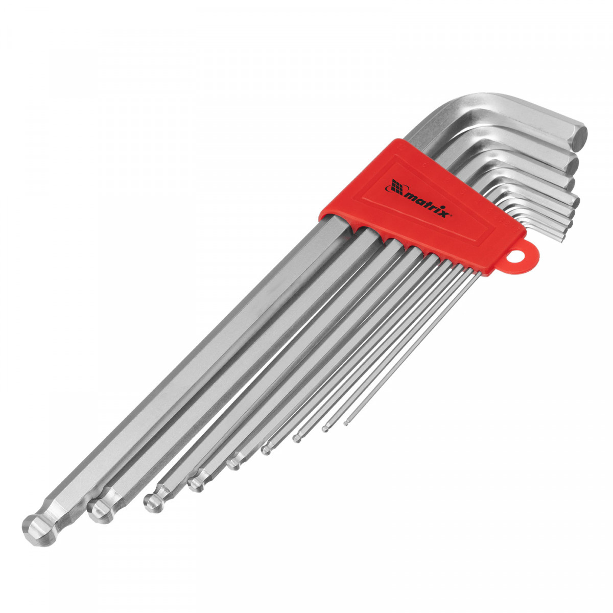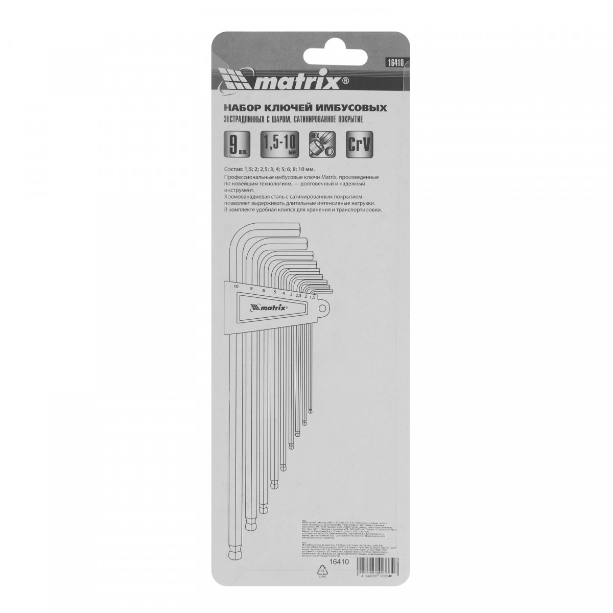 Набор из 9 экстра-длинных имбусовых ключей Matrix 16410 с шаром и сатинированным покрытием, из стали CrV, предназначен для монтажа и демонтажа болтов с внутренним шестигранником HEX 1,5-10 мм. Набор будет полезен для сборки мебели и ремонта велосипедов. Экстра-длинные ключи Г-образной формы облегчают работу в труднодоступных местах.