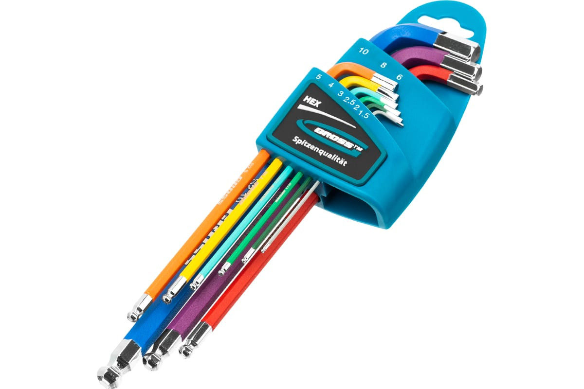 Набор ключей имбусовых HEX, 1,5–10 мм, S2, 9 шт магнит экстра-длин. с шаром хром/краска Gross