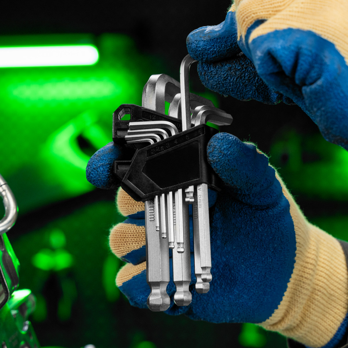 Набор Сибртех 123637 включает в себя 9 имбусовых ключей из стали CrV размером 2-12 мм, с шаром, предназначенных для закручивания и откручивания крепежа со шлицем типа HEX. Шарообразные наконечники можно вставлять в головку крепежа под углом до 25°, что облегчает работу в ограниченном пространстве. Набор пригодится для ремонта велосипедов, сборки мебели, установки и регулировки пластиковых окон.