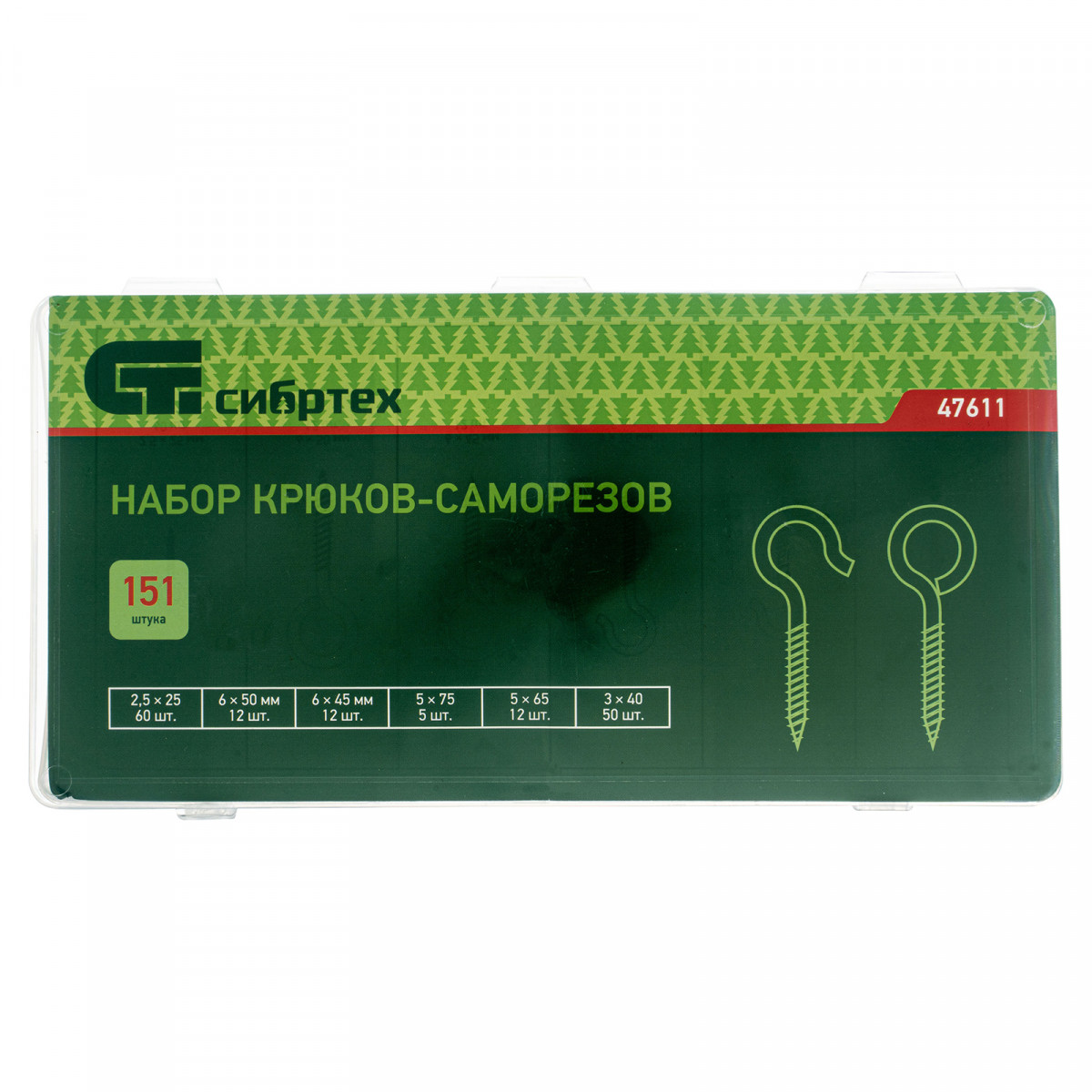Набор крюков-саморезов 2.5 х 25, 3 х 40.5 х 65.5 х 75, 6 х 45, 6 х 50 мм, 151 предмет Сибртех