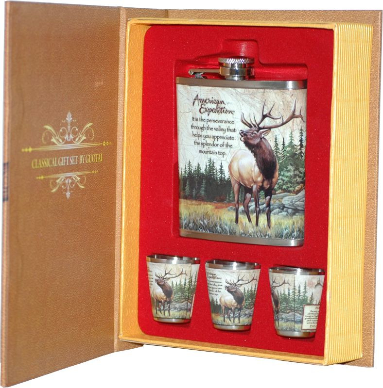 Подарочный набор "Книга охотника" - это набор 4 в 1 в красочной коробке, открывающейся сверху, как книга: фляжка 210 мл и 3 стопки.