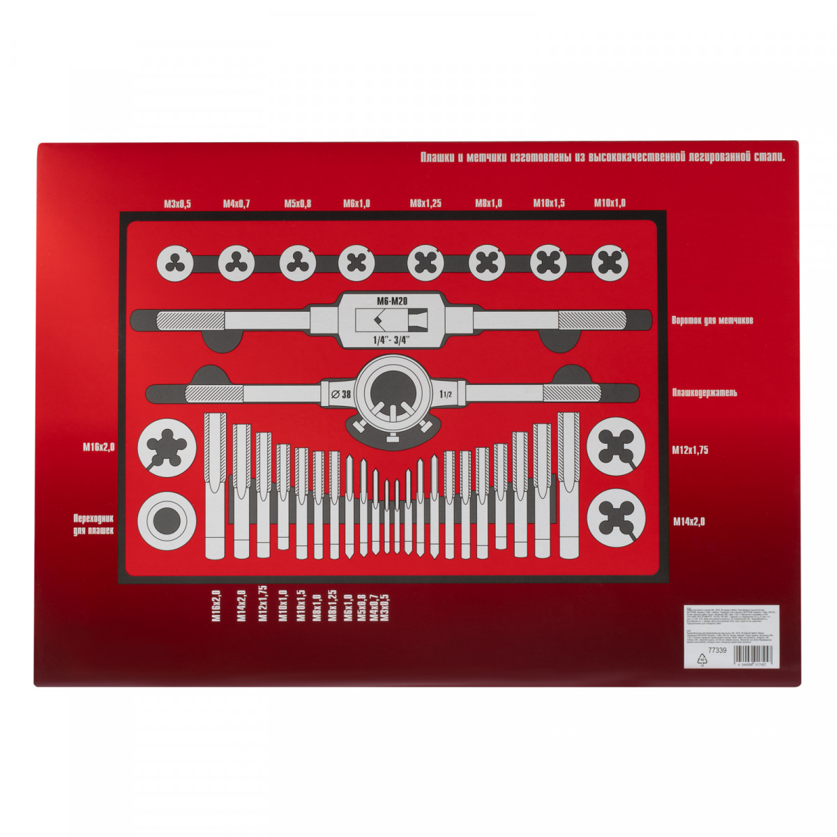 - Быстрый поиск нужного предмета — на каждом инструменте имеется маркировка с обозначением шага и размера резьбы.