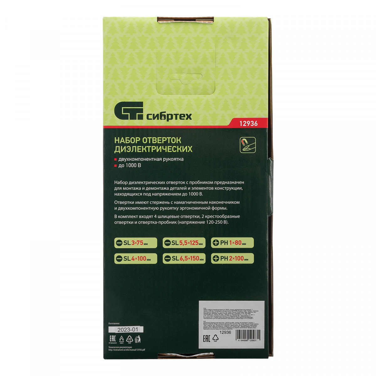 Набор диэлектрических отверток и тестер Сибртех 12936, CrV, с двухкомпонентными рукоятками, состоит из 7 предметов, которые пригодятся при обслуживании электрооборудования и электроприборов. Диэлектрическое покрытие защищает оператора от поражения током во время работ под напряжением до 1000 В. Широкий диапазон длины стержней отверток 80-125 мм позволяет выбрать оптимальную в зависимости от степени углубления крепежа. Важно — техника безопасности запрещает работу под напряжением даже при использовании инструмента с диэлектрическим покрытием!