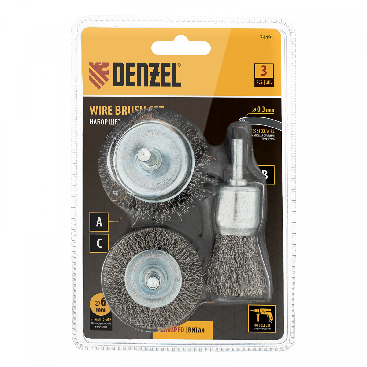 Набор щеток для дрели, 1 Плоская 50мм, 2 Чашки 25-50мм, шпилька, нерж. вит. проволока Denzel