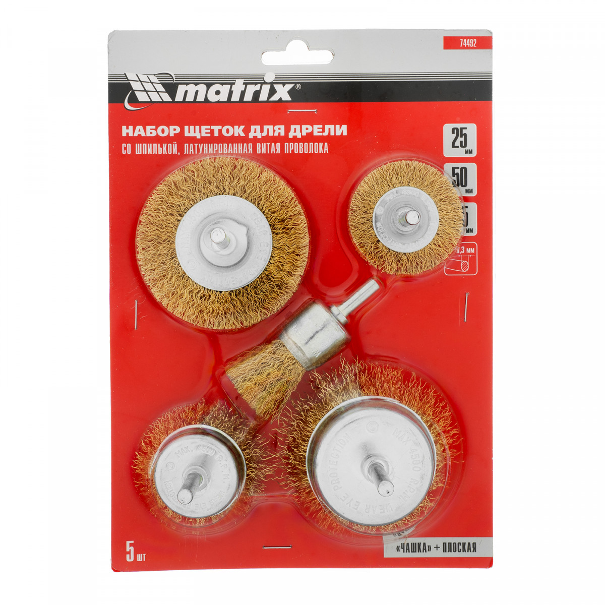Набор щеток для дрели, 5 шт, 2 плоские, 50-75 мм, 3 "чашки", 25-50-75 мм, со шпильками Matrix