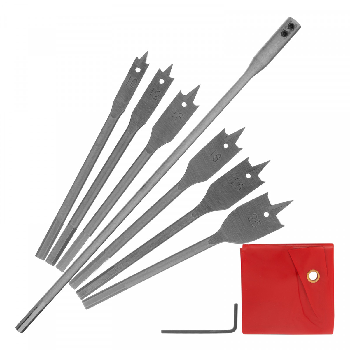 Набор Matrix 70406, предназначенный для работ по дереву, включает 6 перовых сверл диаметром 10-12-16-18-20-25 мм и удлинитель 300 мм. Рабочая часть в виде лопатки с подрезателями по бокам обеспечивает эффективное сверление глубоких сквозных и глухих отверстий. Оснастка устанавливается на механические и электрические дрели, а также шуруповерты.