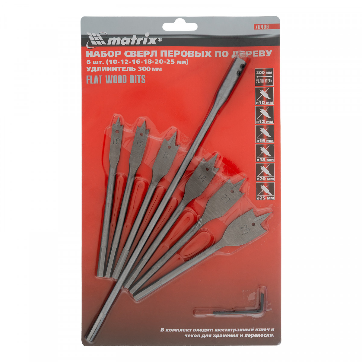 Набор сверл перовых по дереву, 10-12-16-18-20-25 мм, 6 шт, удлинитель 300 мм Matrix