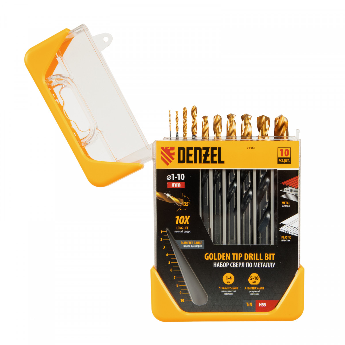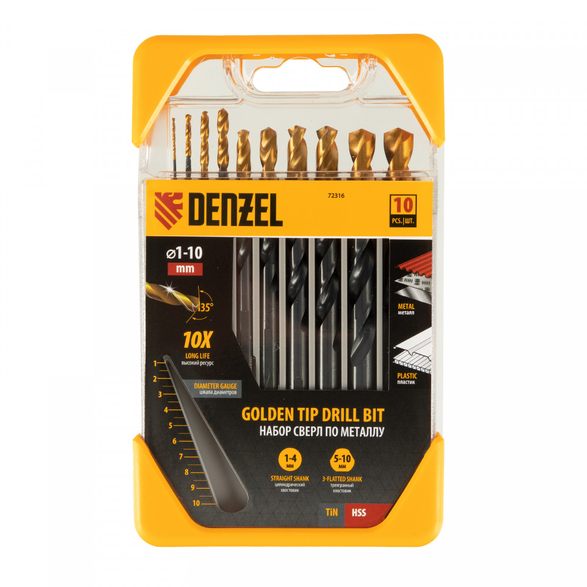 Набор сверл по металлу, 1-10 мм, HSS-Tin, Golden Tip, 10 шт Denzel