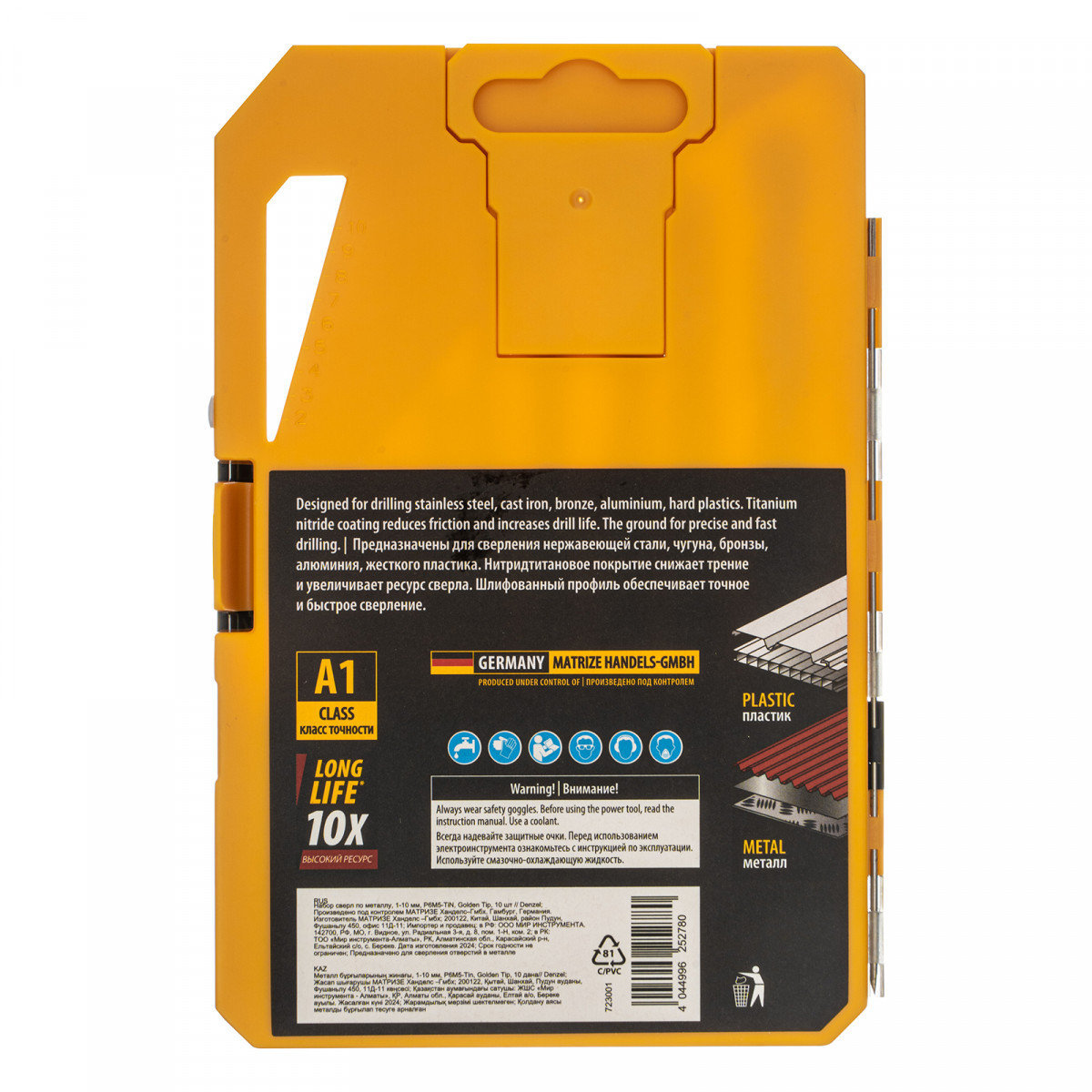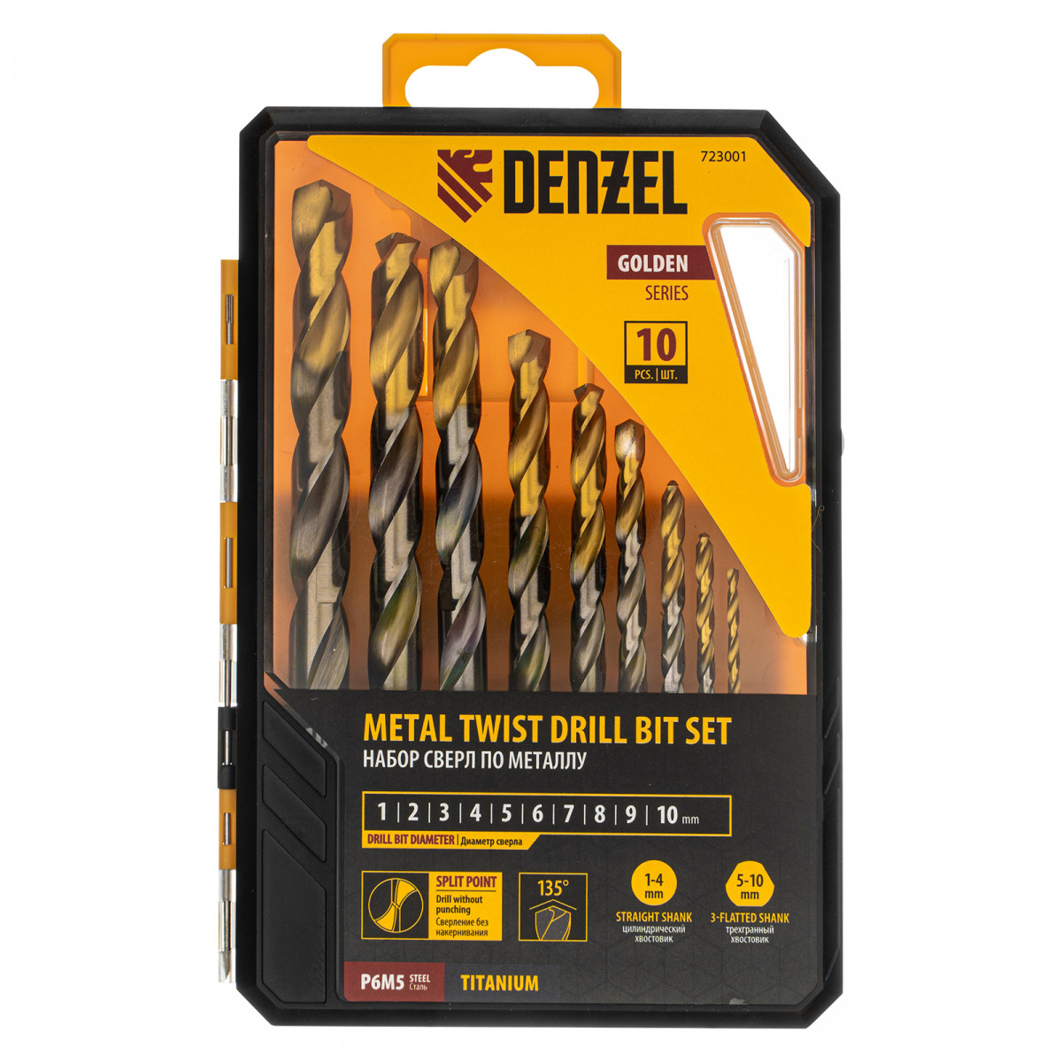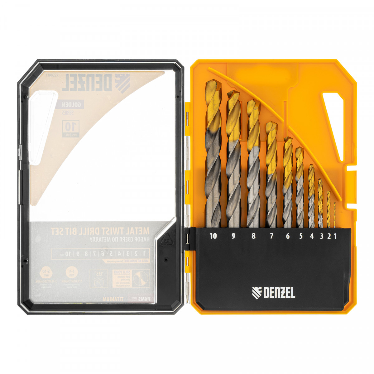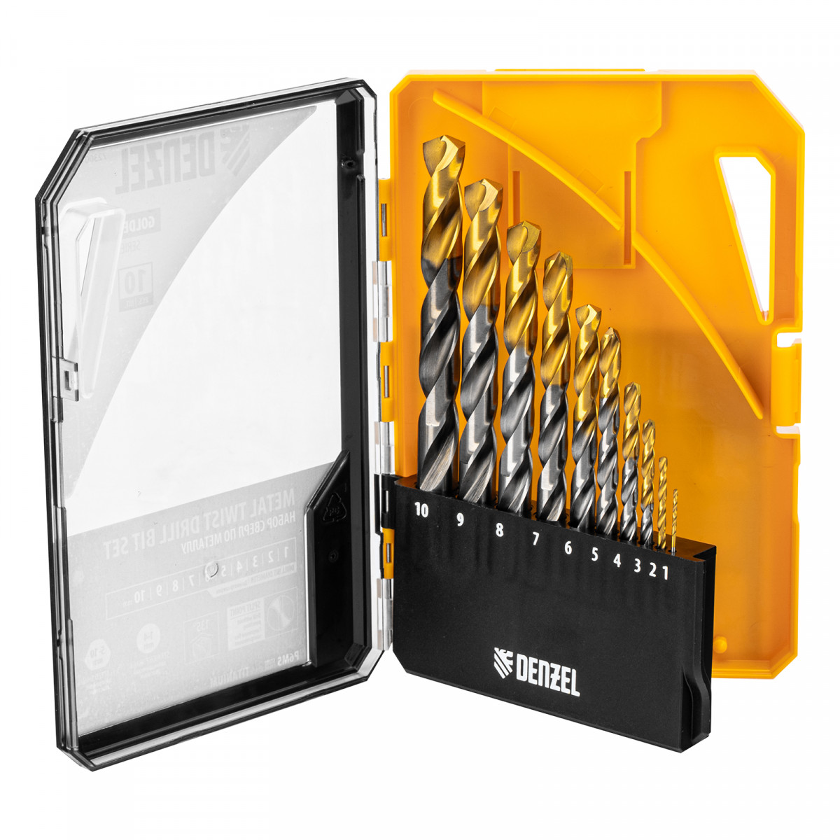 Набор сверл по металлу, 1-10 мм, Р6М5-TiN, Golden Tip, 10 шт Denzel