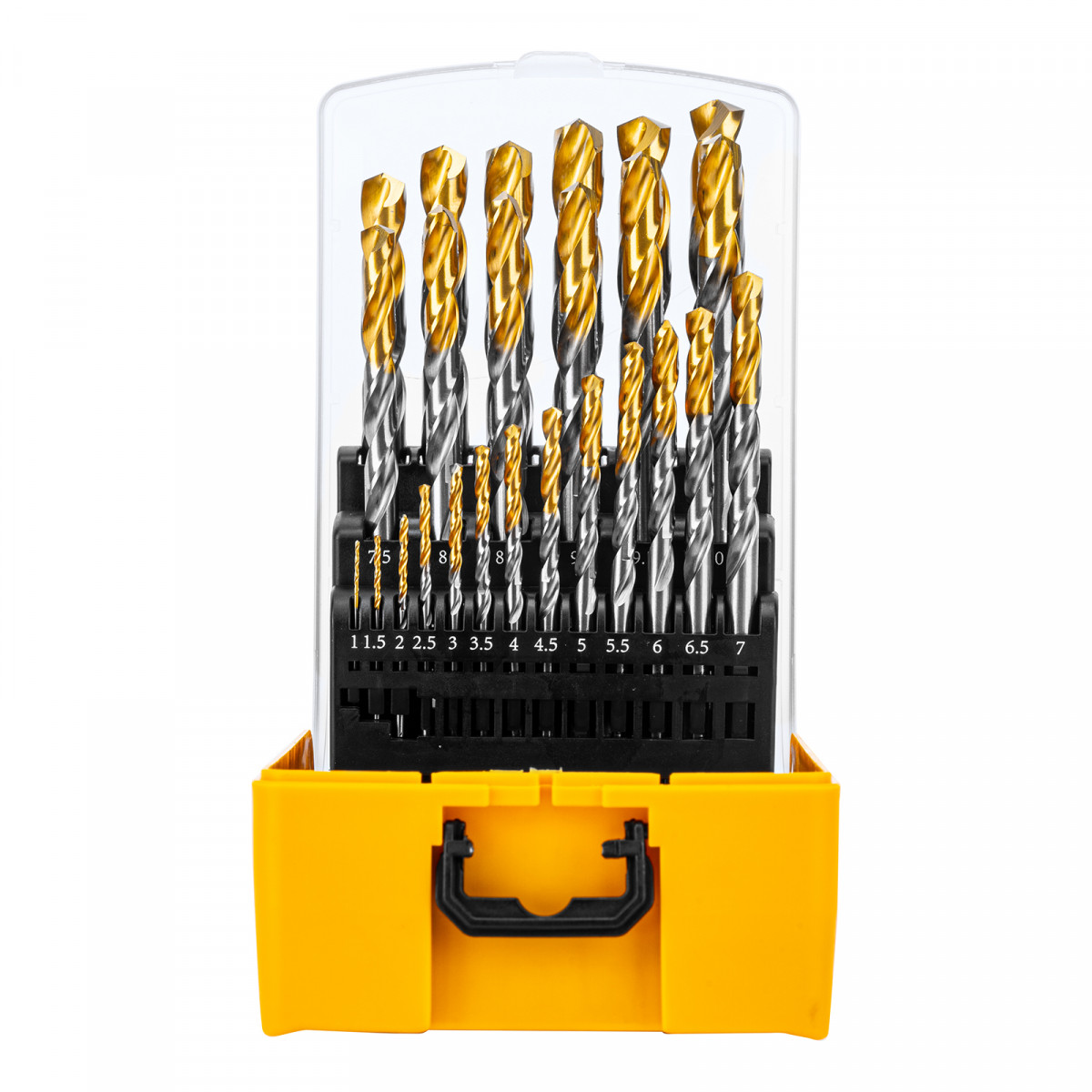 - Удобная упаковка — сверла поставляются в пластиковом кейсе с шаблоном для определения диаметра сверл.