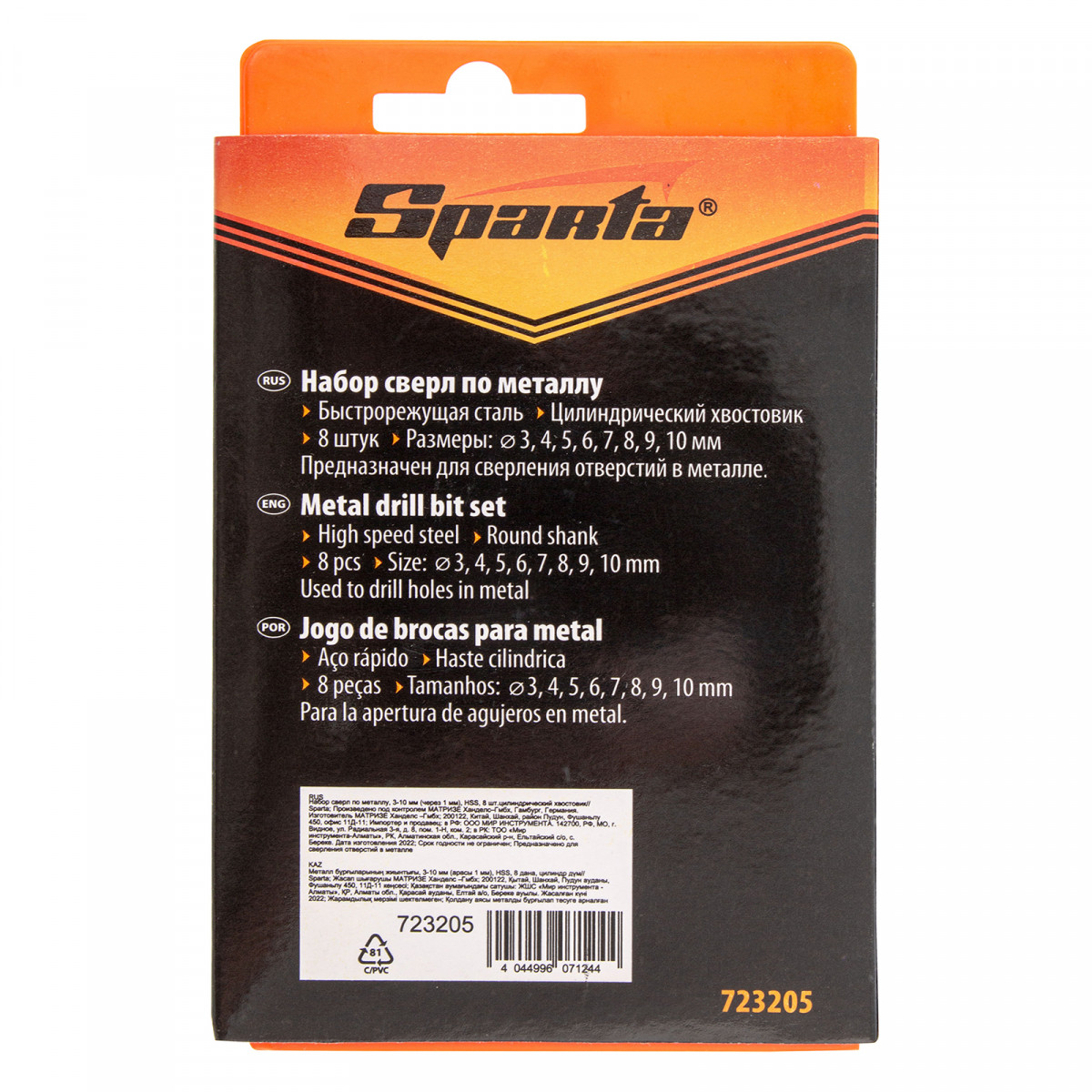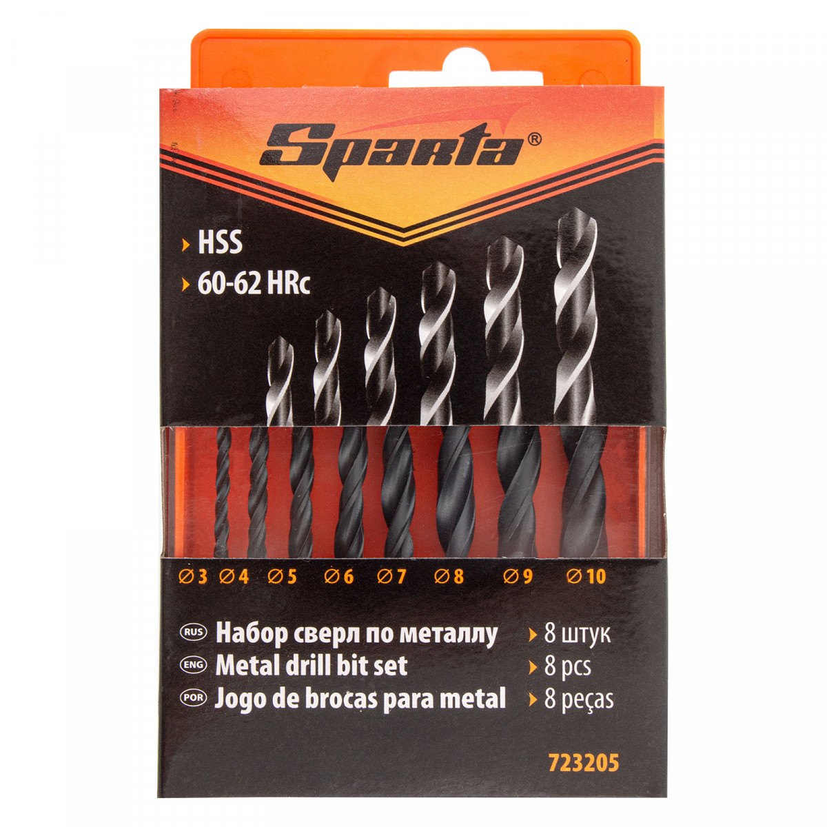 Набор сверл по металлу, 3-10 мм, (через 1 мм) HSS 8 шт, цилиндрический хвостовик Sparta