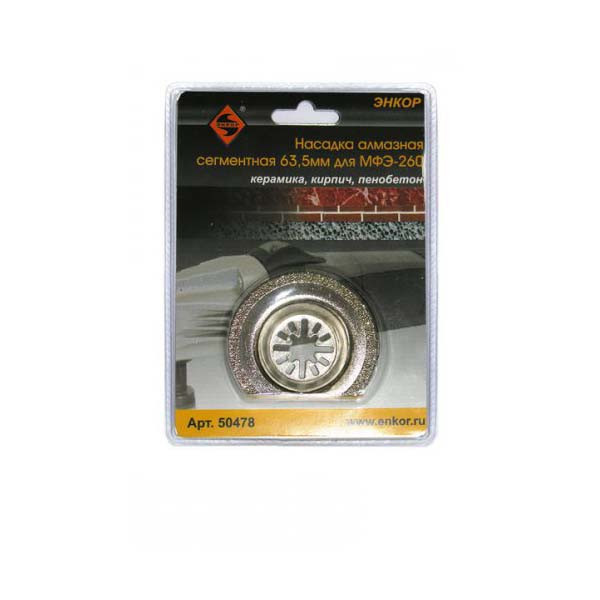 Насадка Энкор 50478 используется при работе универсальной вибромашиной МФЭ-260. Насадка имеет алмазную кромку, выполнена в форме сегмента и предназначена для осуществления резов в керамике, кирпиче и пенобетоне. Диаметр 63.5 мм.