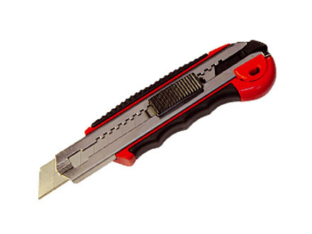 Пластмассовый эргономичный обрезиненный корпус с усиленной направляющей. Нож имеет автоматическую фиксацию лезвия. Замена лезвия осуществляется автоматически. Конструкция ножа включает в себя обойму, содержащую 5 запасных лезвий. Предназначен для разрезания бумаги, картона и прочих материалов.