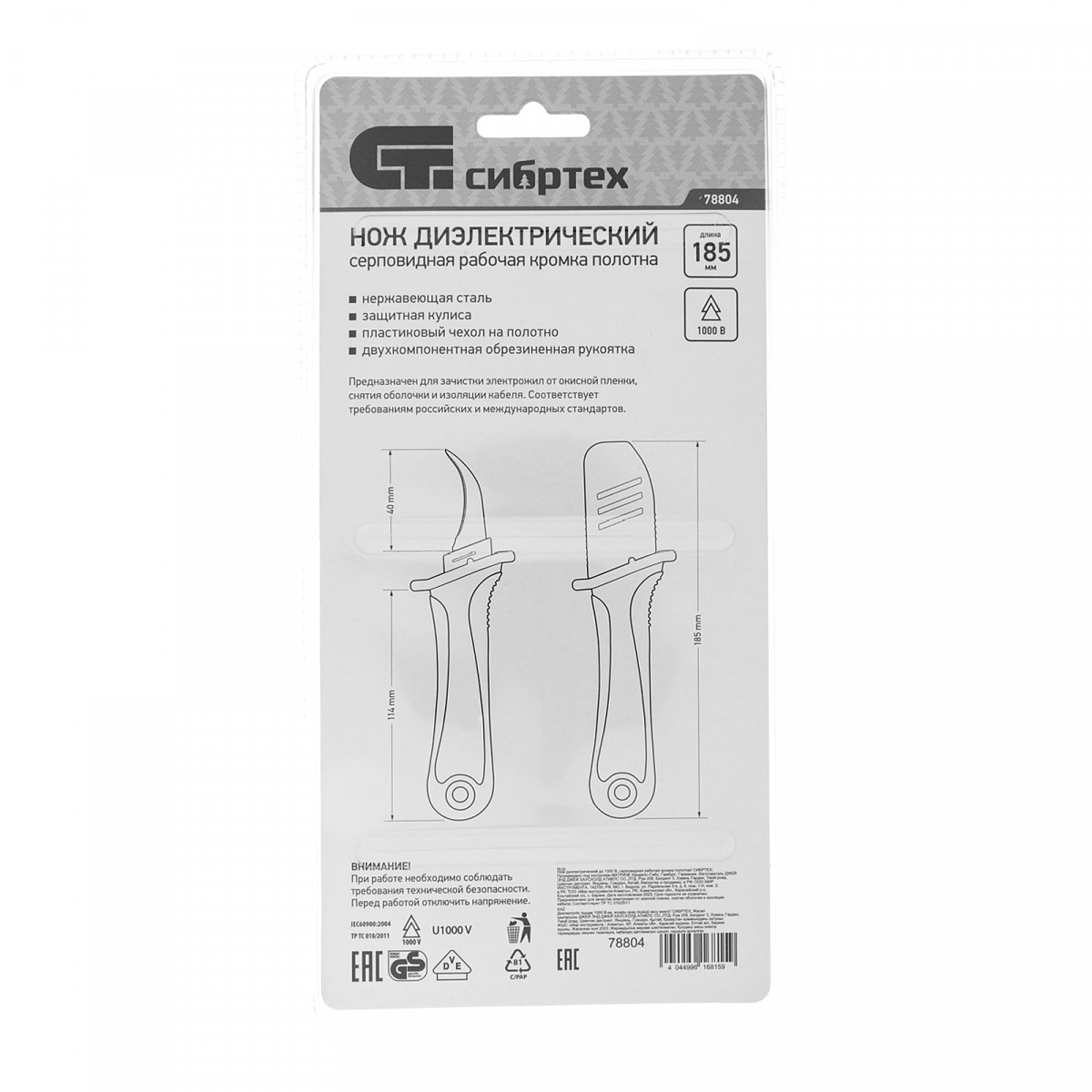 Диэлектрический нож до 1000 В Сибртех 78804 с серповидной рабочей кромкой полотна будет полезен во время электромонтажных работ. С его помощью можно снять изоляцию с кабеля и зачистить электрожилы. Во время использования необходимо соблюдать требования технической безопасности, перед выполнением работ требуется отключить напряжение.