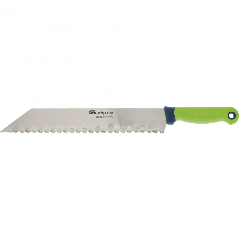 Нож Сибртех 79025 общей длиной 475 мм и длиной лезвия 340 мм, с обрезиненной рукояткой, предназначен для резки теплоизоляционных панелей. Он пригодится в ходе проведения строительных работ при укладке утеплителя. Лезвие длиной 340 мм легко справляется с резкой длинных и толстых пластов.
