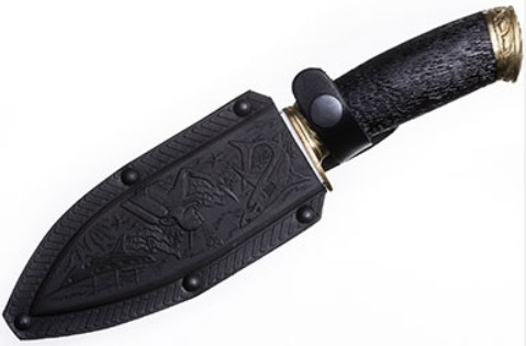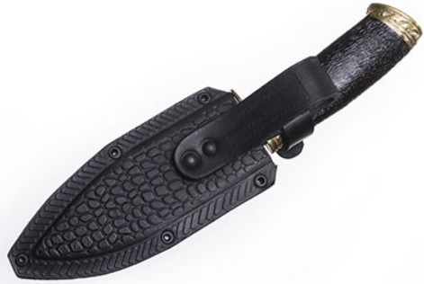 В комплекте с ножом поставляются ножны из натуральной кожи с петлей для крепления на ремень. Они надежно удерживают нож при помощи ремешка с клепкой.