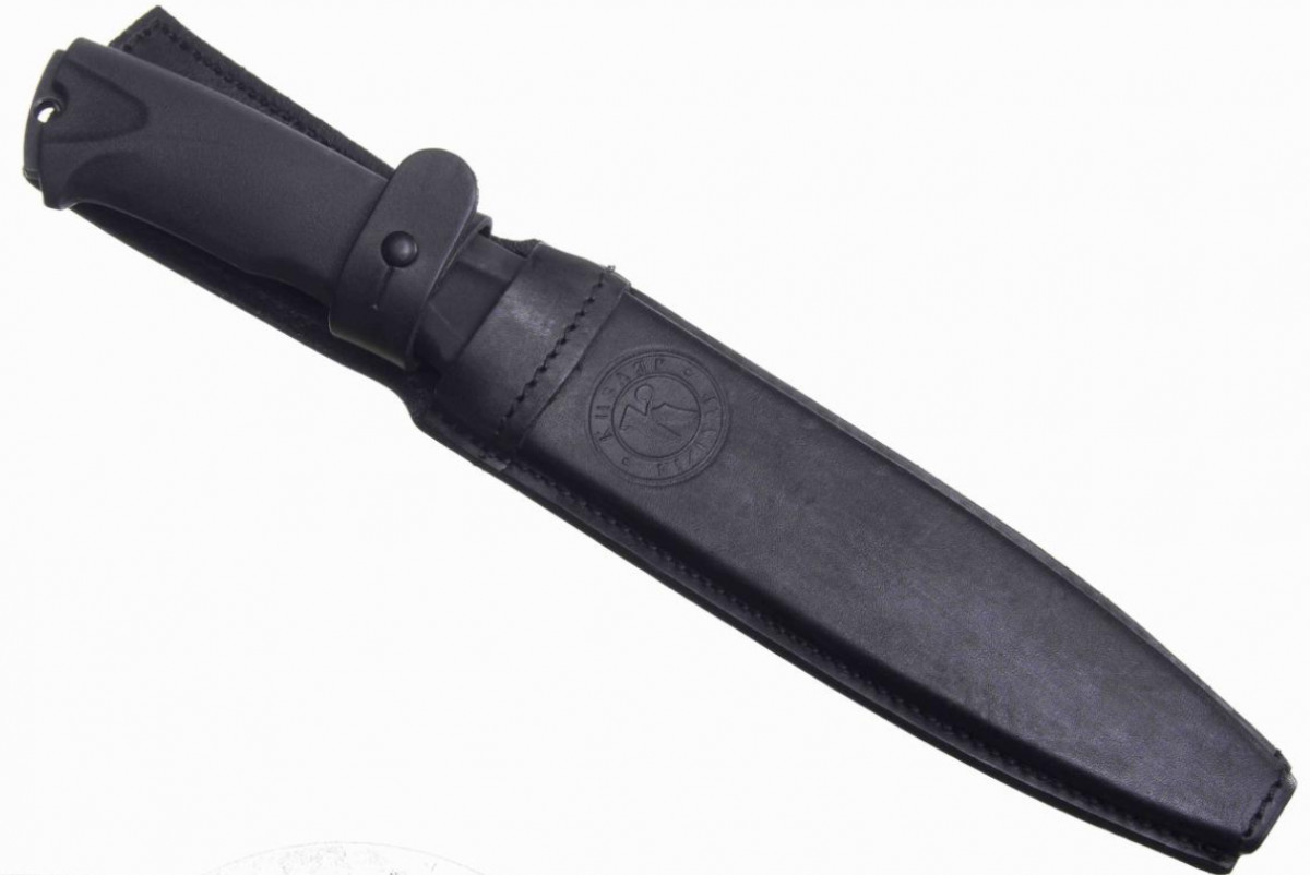 Рукоять изготовлена из эластрона. Это доступный и очень прочный материал. Устойчив к химическим веществам, не боится истирания, хорошо себя чувствует, как при низких, так и при повышенных температурах (-40 + 130). В заднике ножа, клинок выступает, образуя ударное навершие с темлячным отверстием.