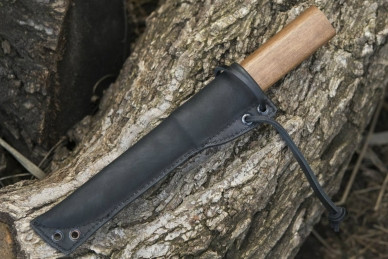 В комплекте поставляются прочные ножны, выполненные из натуральной кожи черного цвета. В ножнах имеются специальные двойные отверстия сверху и снизу, позволяющие закреплять нож на элементах снаряжения.