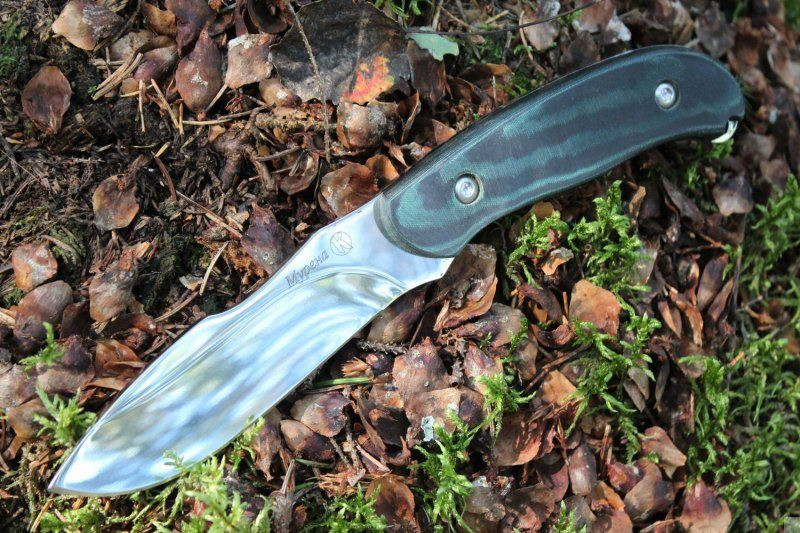 Клинок выполнен из AUS-8 — это нержавеющая сталь японского производства. Она хорошо выдерживает ударные нагрузки и быстро точится. Но с другой стороны, заточку держит средне и нуждается в частой правке. Спуски на клинке идут вогнутые, такой нож будет хорошо вгрызаться в материал и им будет удобно строгать, но контролировать рез будет сложнее.