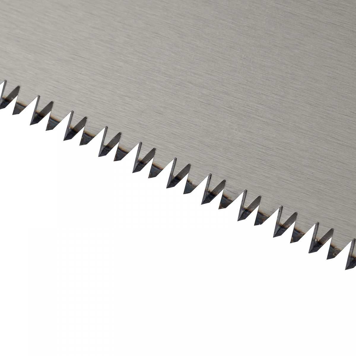 Ножовка по дереву Denzel 24140 длиной 450 мм, с зубьями с шагом 9 TPI и 3D-заточкой, с металлопластиковой рукояткой, предназначена для продольной и поперечной распиловки заготовок из древесины, ДСП, ДВП, МДФ, ламината, а также из ПВХ (труб, панелей, коробов). Подходит для спиливания молодых веток. Зубья с шагом 9 TPI позволяют выполнять быстрый рез. Ножовка используется для проведения столярных работ в мастерской и на дачном участке.