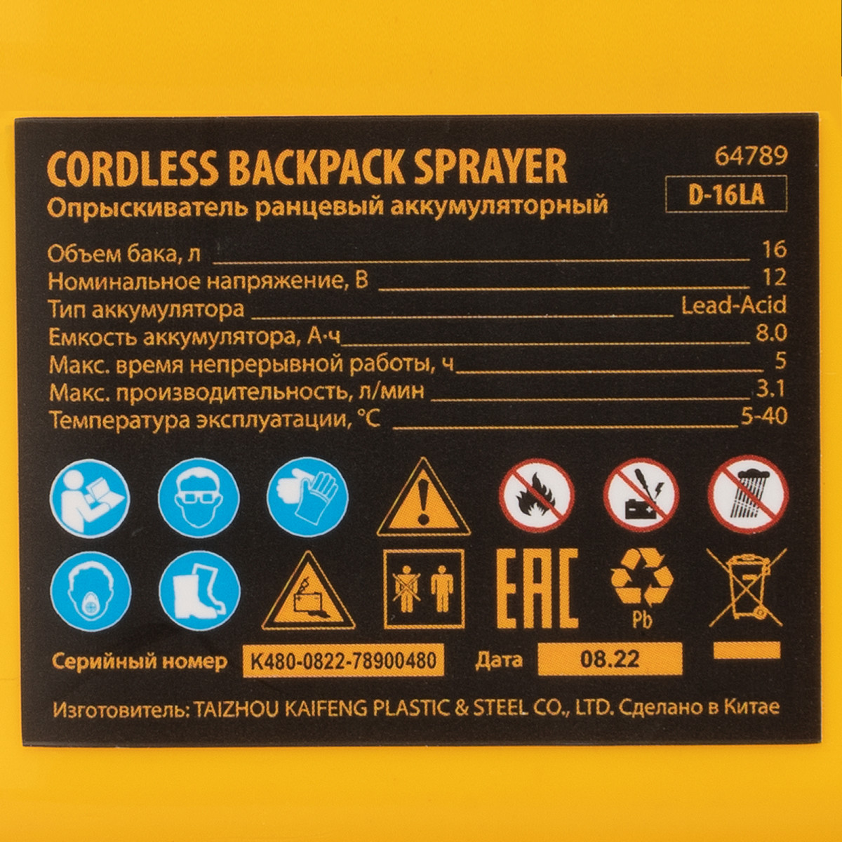 Опрыскиватель ранцевый аккумуляторный D-16LA, 16 л, 12 В, 8 Ач Denzel