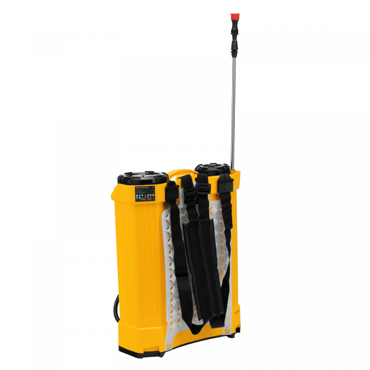 Ранцевый аккумуляторный опрыскиватель Denzel D-16LA 64789 с баком объемом 16 л и батареей на 12 В, емкостью 8 Ач, предназначен для распыления воды или инсектицидов. Используется для ухода за растениями, дезинфекции помещения, мытья окон и фасадов. Длина штанги регулируется в диапазоне 470-820 мм, а максимальная дальность распыления составляет 4 м, что облегчает обработку труднодоступных мест.