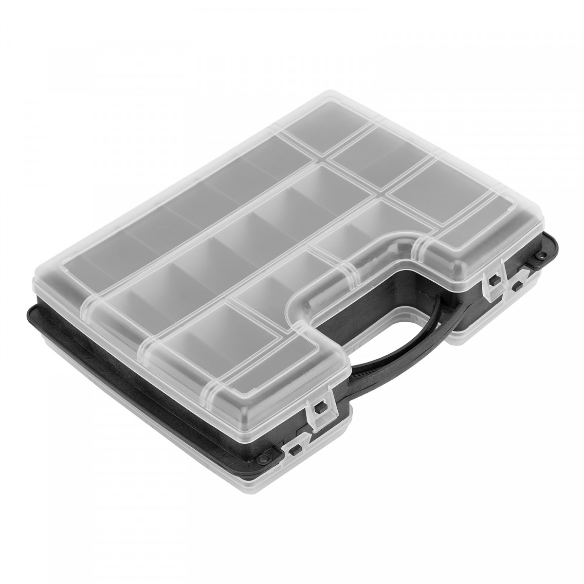 Двухсторонний органайзер Сибртех 90738 размером 295 х 220 х 76 мм помогает рассортировать мелкие вещи и хранить их в порядке и безопасности. В него можно положить снасти, крепеж, элементы рукоделия и т.д. Органайзер не занимает много места, поэтому его можно поместить под кровать, на стеллаж и в другие укромные места.