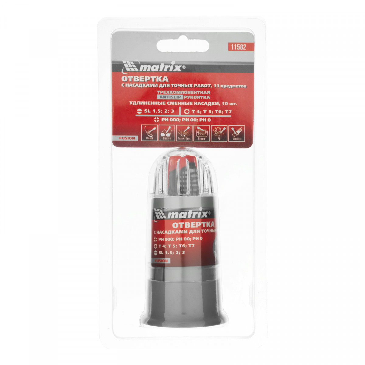 Отвертка для точных работ Fusion с насадками, 11 предметов, в пластиковом пенале, трехкомпонентная рукоятка Matrix