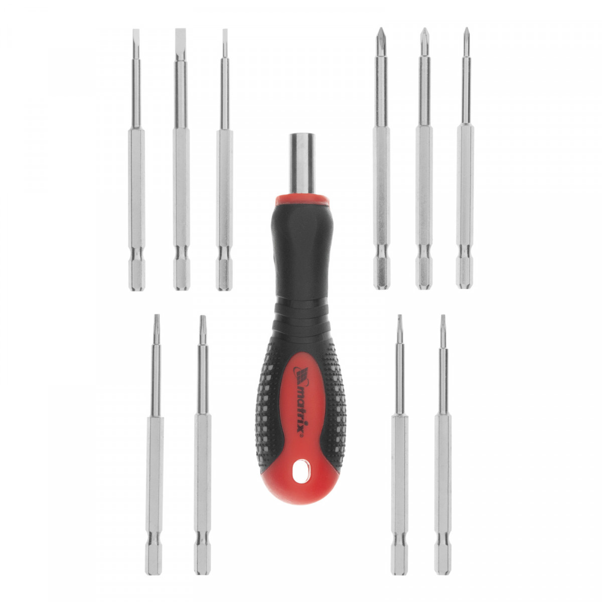 Отвертка для точных работ Matrix Fusion 11582 с 3-х компонентной рукояткой, с насадками, — это набор из 11 предметов в пластиковом пенале, который используется для ремонта электротехники, очков, мобильных телефонов, ноутбуков и т.д. Набор пригодится профессиональным мастерам. 10 удлиненных бит с зауженным профилем обеспечивают возможность работы в углублениях.