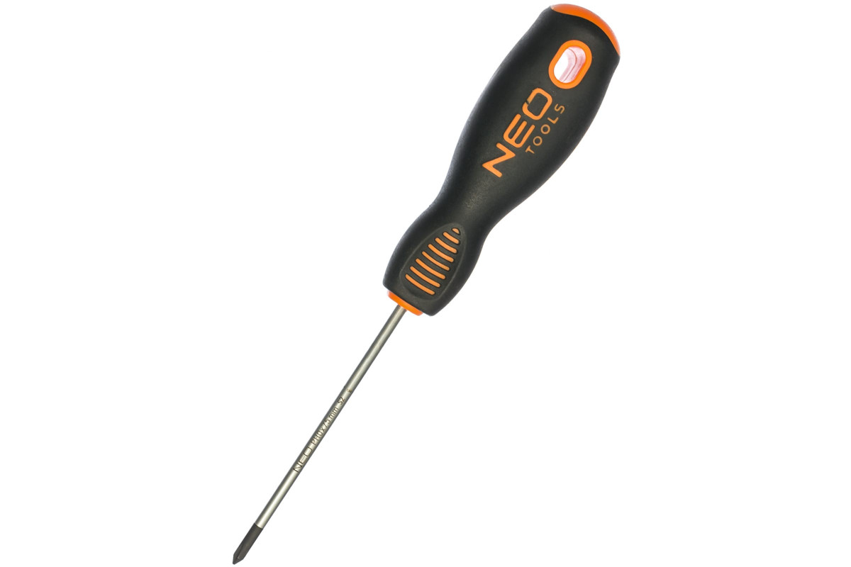 Отвертка крестовая PH NEO. Стержень отвертки изготовлен из чрезвычайно прочной хромомолибденовой стали. Рабочая часть подвергнута термообработке, благодаря чему получена требуемая твердость и стойкость к изгибу 56 HRC. Отвертка с намагниченным жалом. Трехгранная форма рукоятки с профилированной опорой для большого пальца уменьшает нагрузку на ладонь во время работы и облегчает быстрое вращение отвертки. Двухкомпонентная рукоятка предотвращает скольжение в ладони, стойкая к воздействию химических веществ, масел и смазок.