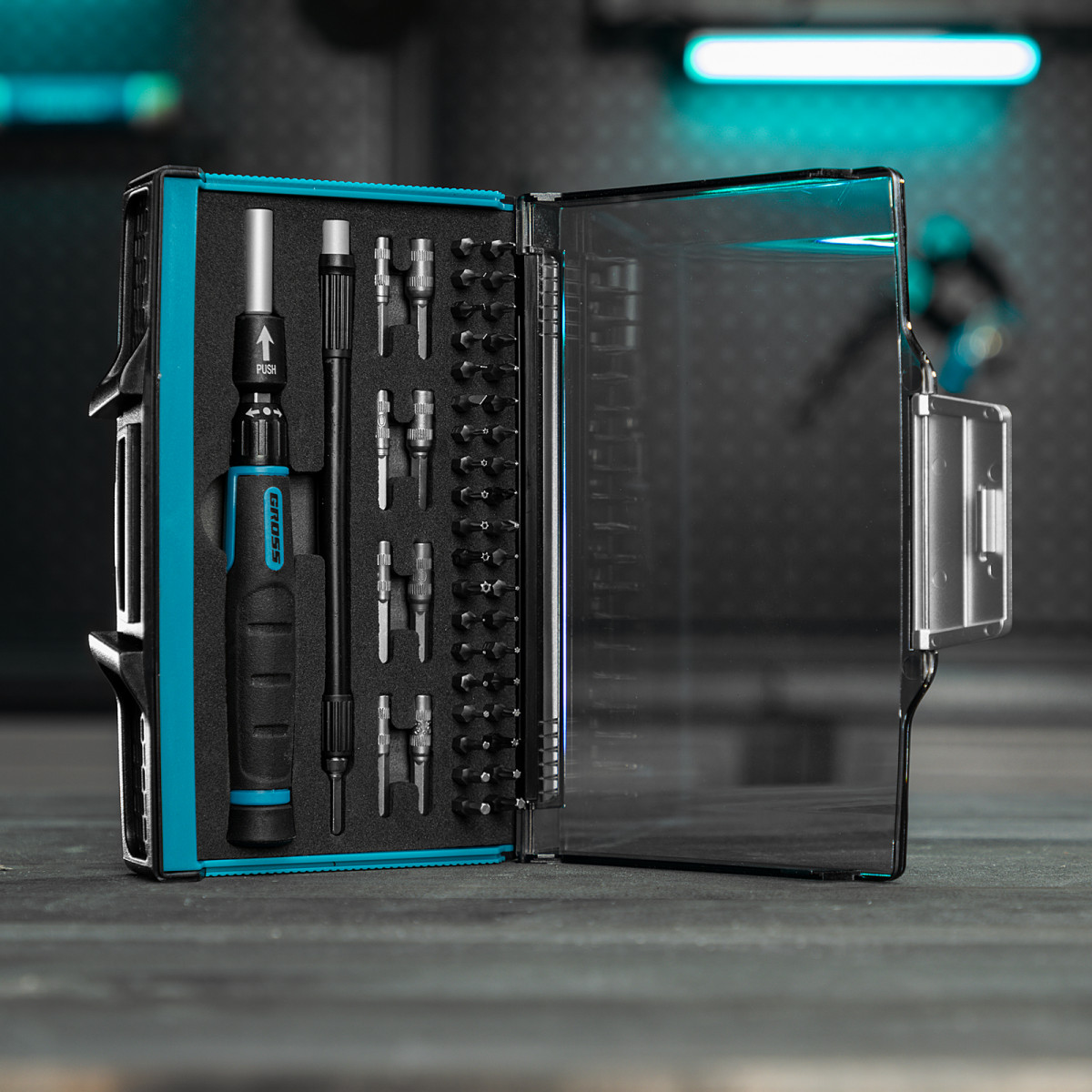 Пластиковый кейс - 1 штБиты для точных работ PH: 000, 00, 00, 0, 1 - 5 штБиты для точных работ PZ: 000, 00, 00, 0, 1 - 5 штБиты для точных работ SL: 0.8, 1.2, 1.5, 1.8, 2.0, 3.0 - 5 штБиты для точных работ Hex: 0.7, 0.9, 1.3, 1.5, 2.0, 2.5, 3.0 - 7 штБиты для точных работ Torx: T3, T4, T5, T6, T7, T8, T9, T10, TT6, TT7, TT8, TT9, TT10, TT15 - 14 штТорцевые головки: 2.5, 2.5, 3.0, 3.0, 3.5, 4.0, 4.5, 5.0 мм - 8 штТелескопическая реверсивная отвертка для точных работ - 1 штГибкий удлинитель 4 мм x 150 мм - 1 шт