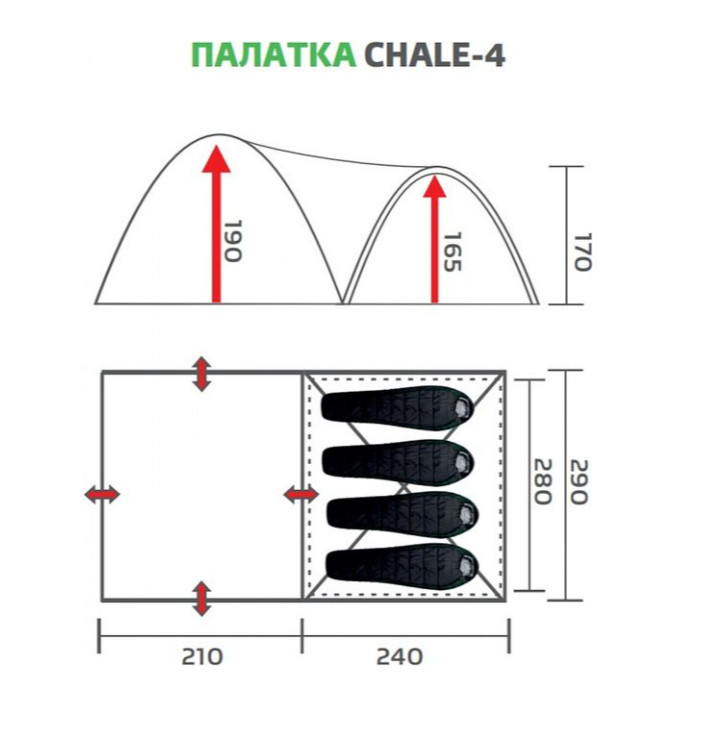 Размеры внешнего тента: (210+240)×290×190/170 см.