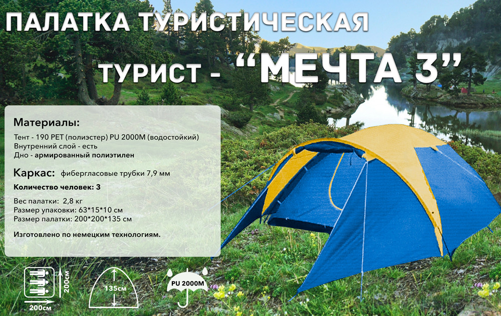 Туристическая палатка Мечта-3 идеально подойдет для комфортного проживания трех человек во время походов и путешествий. Компактные размеры (200*200-135 см) делают ее удобной в транспортировке, а прочные материалы обеспечивают надежную защиту от непогоды.