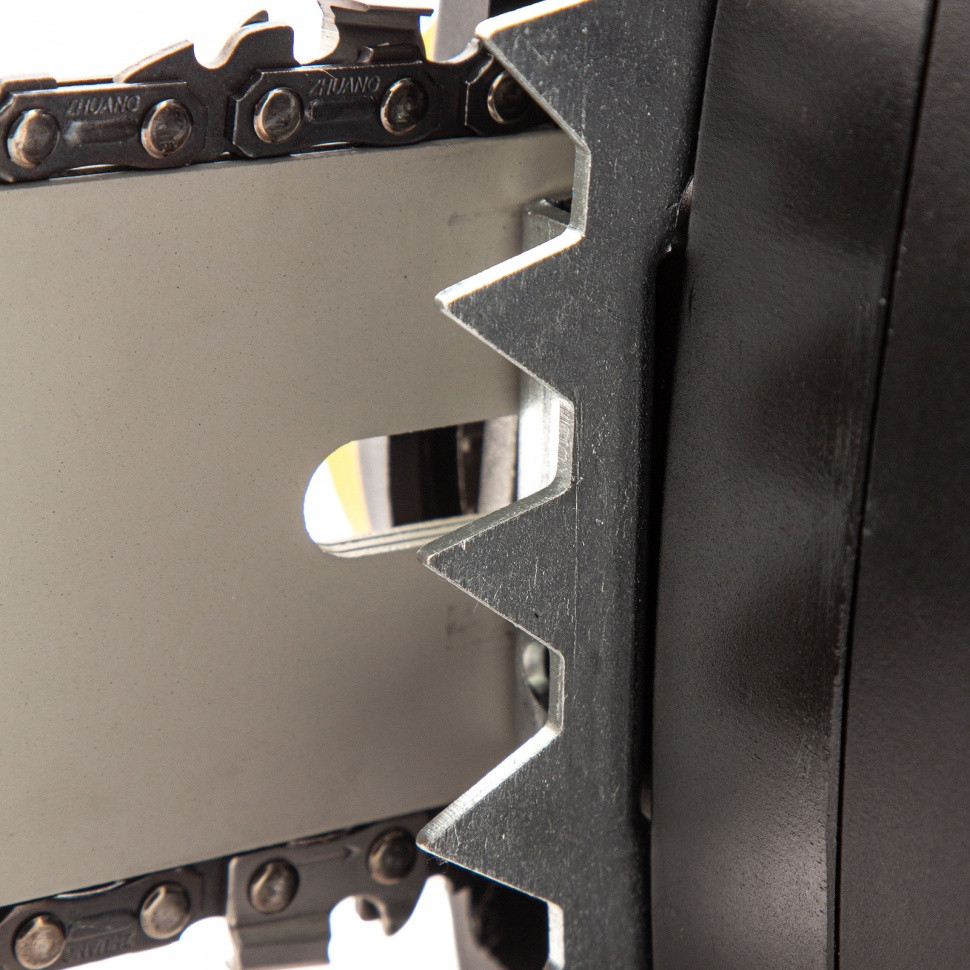 - Удобная эксплуатация — зубчатый упор не соскальзывает с древесины, надежно фиксируя пилу и уменьшая нагрузку на руки пользователя, что особенно удобно для работы с крупными бревнами или деревьями.