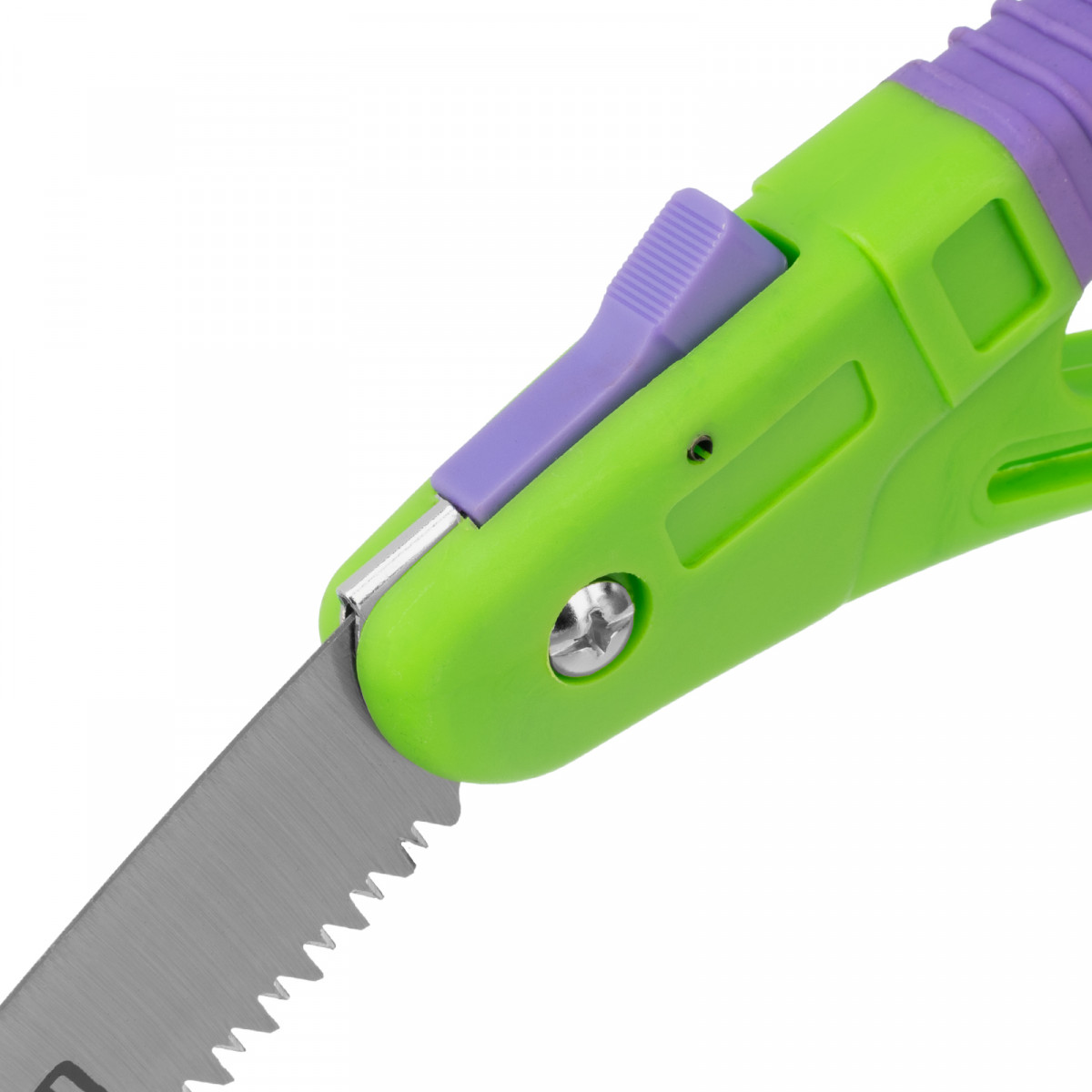 Садовая складная пила Palisad 60411 с полотном длиной 175 мм, пластиковой обрезиненной рукояткой и защитной кулисой, предназначена для продольного и поперечного распила сухой или сырой древесины. Зубья трехгранной формы с шагом 6-7 TPI облегчают работу и обеспечивают чистый и ровный рез. Складная пила удобна и безопасна в транспортировке и хранении, что делает ее оптимальной для использования на выездных работах и в походах.