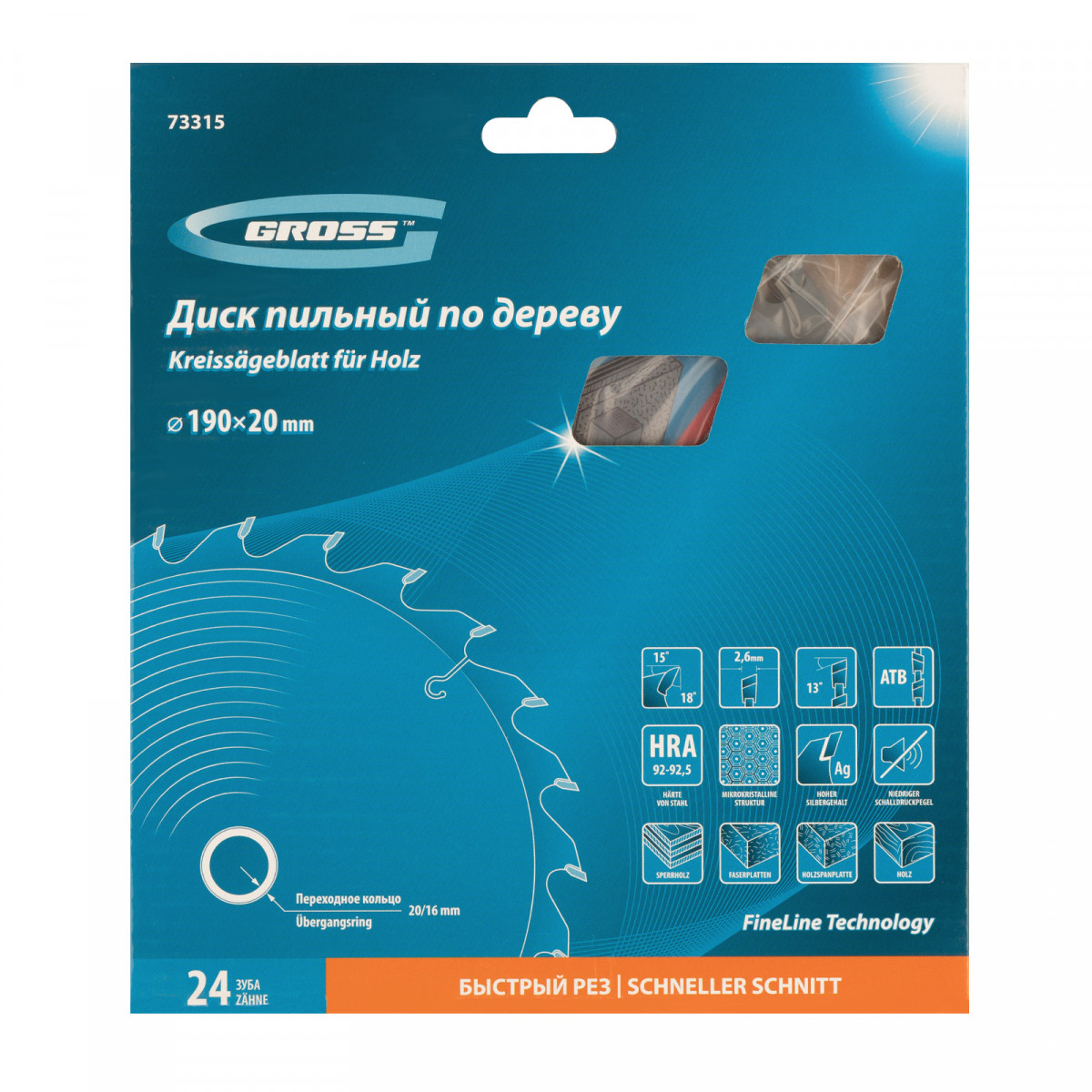 Пильный диск Gross 73315, ф190 х 20 мм, с 24 зубьями и переходным кольцом 20/16 мм, предназначен для распила древесины мягких и твердых пород, ДСП, МДФ и фанеры. Является оснасткой для циркулярных и торцовочных пил с посадочным диаметром 20 мм, благодаря универсальному типу зубьев АТВ подходит как для продольного, так и для поперечного реза материалов. Диск изготовлен на высококачественном оборудовании, специально рассчитан на профессиональное применение и выполнение большого объема работ.