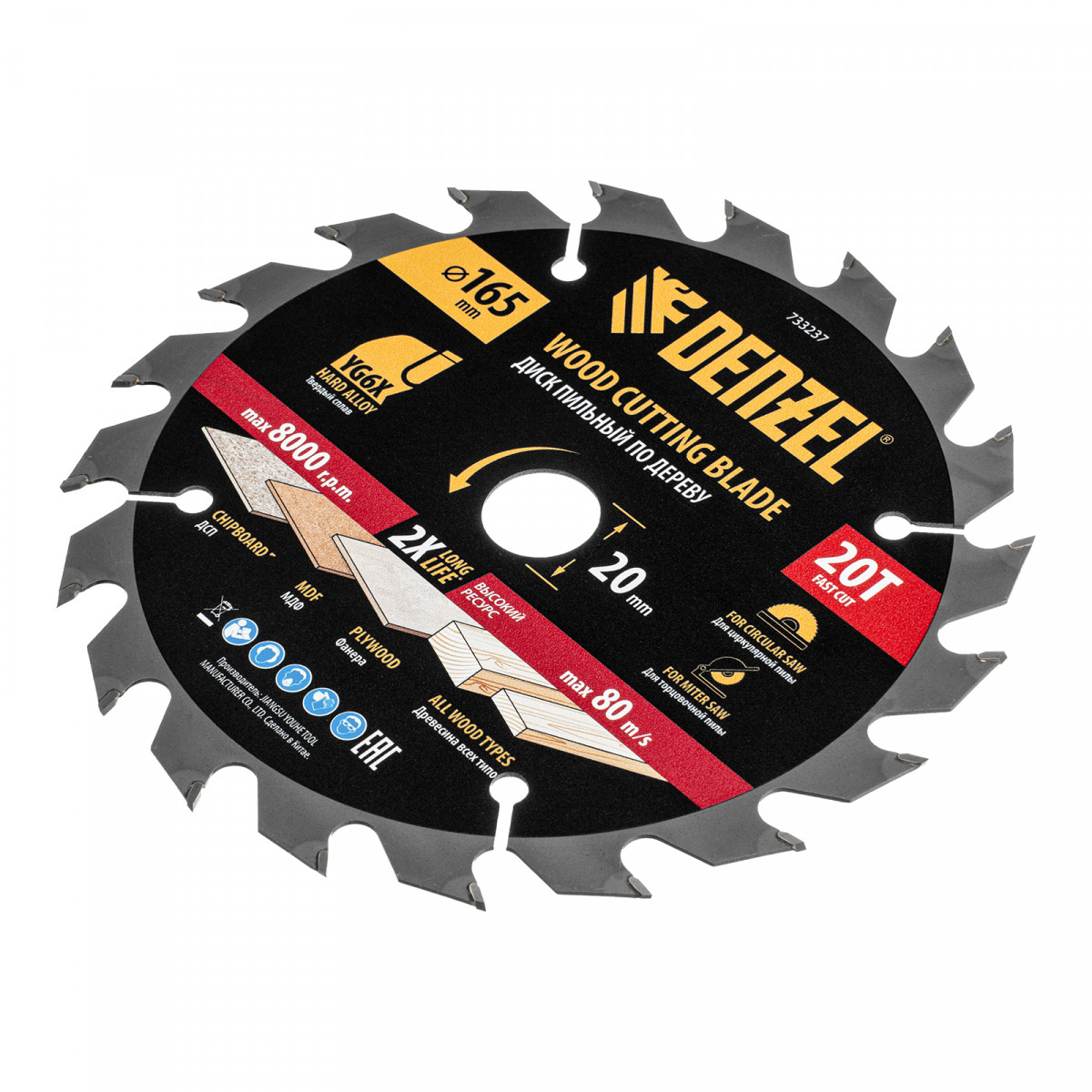 Пильный диск Denzel 733237 диаметром 165 x 20 мм, с 20 зубьями, предназначен для продольного и поперечного распила твердой и мягкой древесины, фанеры, МДФ, ДСП. 20 зубьев типа ATB с режущими пластинами оптимальной геометрии обеспечивают быстрый рез. Режущие пластины из твердого сплава YG6X сохраняют рабочие свойства при интенсивном использовании. Диск устанавливается на циркулярную, торцовочную пилу или на распиловочный станок. В комплект поставки входит переходное кольцо с 20 на 16 мм, что позволяет изменить посадочный размер и расширяет возможности использования диска.