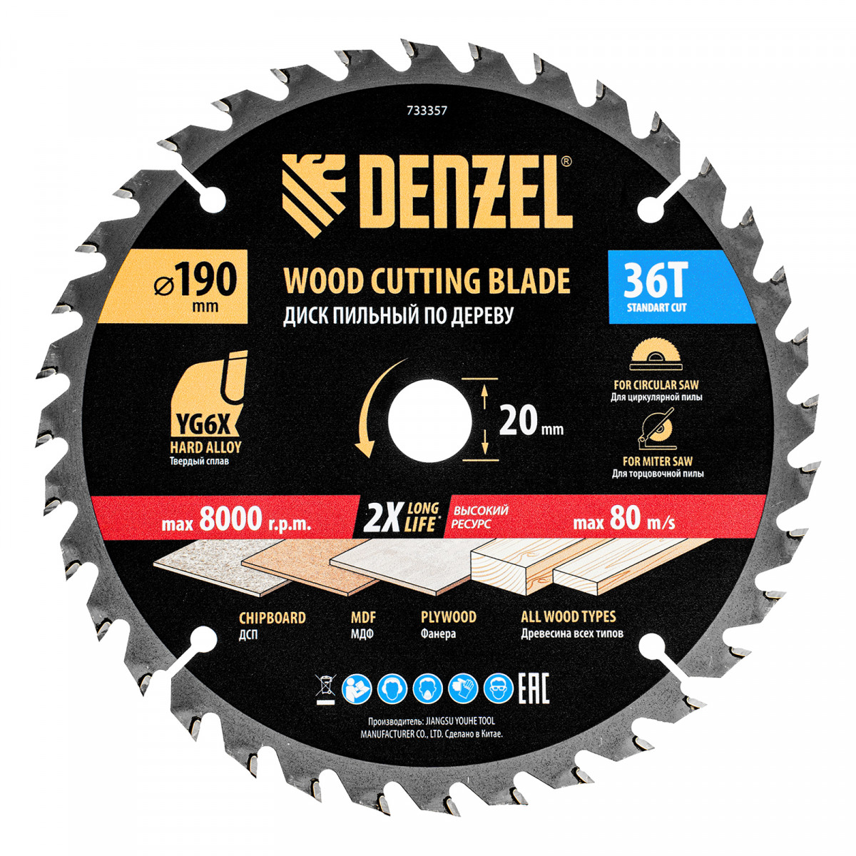 Пильный диск Denzel 733357 диаметром 190 x 20 мм, с 36 зубьями, предназначен для продольного и поперечного распила твердой и мягкой древесины, фанеры, МДФ, ДСП. 36 зубьев типа ATB с режущими пластинами оптимальной геометрии обеспечивают качественный рез. Тип реза — стандартный. Режущие пластины из твердого сплава YG6X сохраняют рабочие свойства при интенсивном использовании. Диск устанавливается на циркулярную, торцовочную пилу или на распиловочный станок. В комплект поставки входит переходное кольцо с 20 на 16 мм, что позволяет изменить посадочный размер и расширяет возможности использования диска.