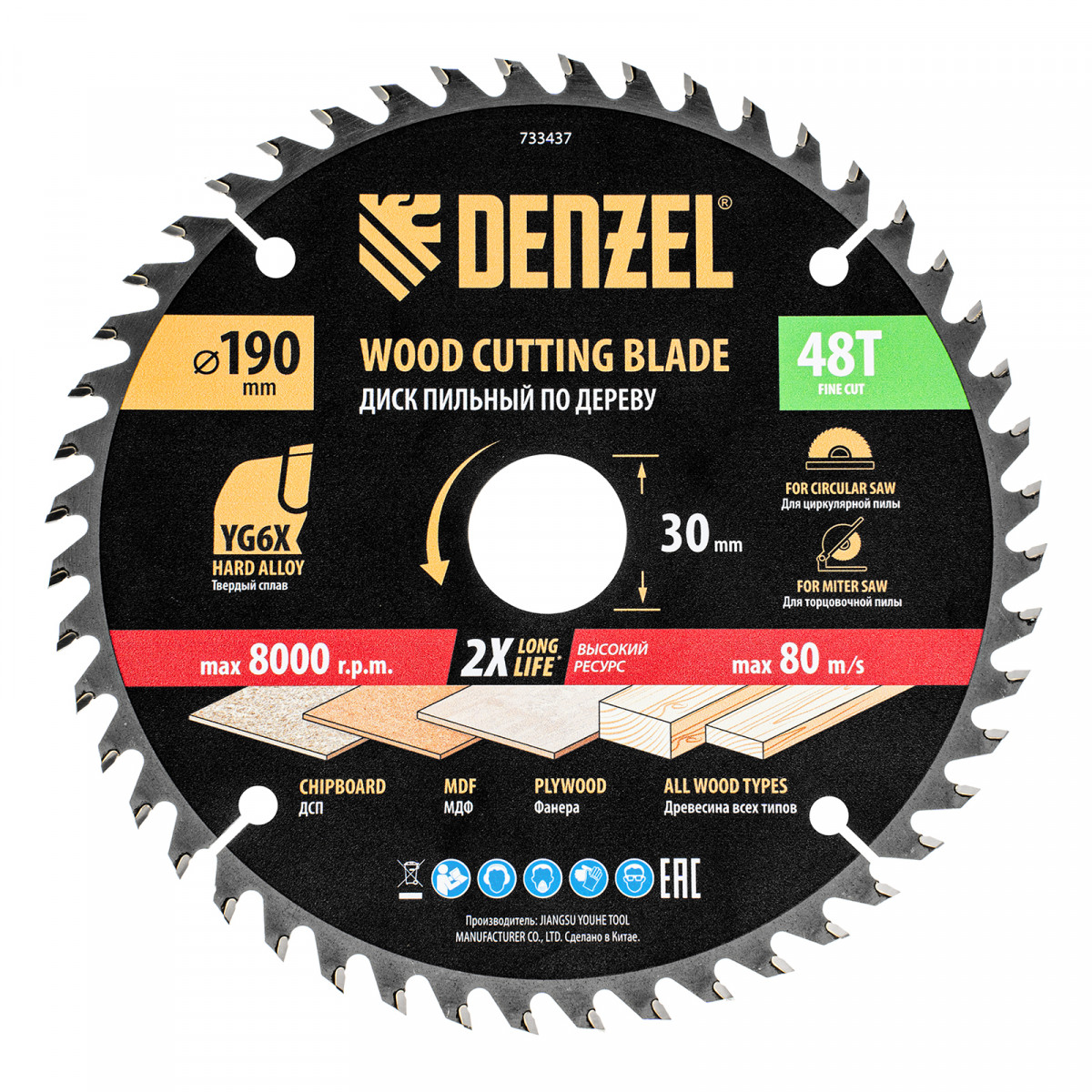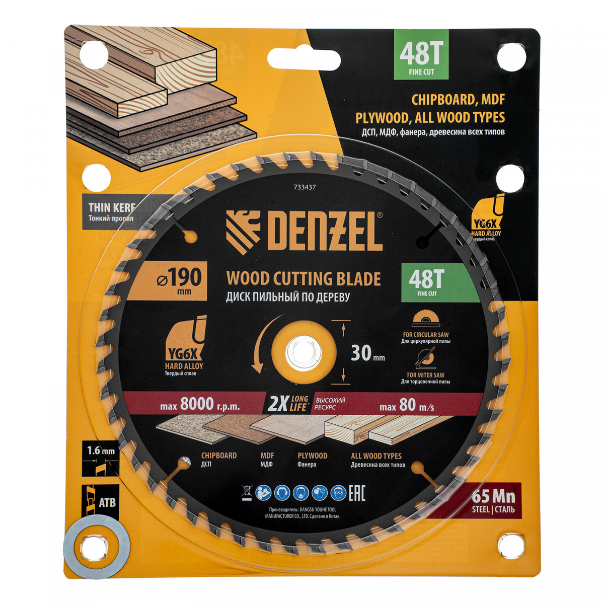 Тонкий пильный диск Denzel 733437 диаметром 190 x 30 мм, с 48 зубьями, устанавливается на циркулярную, торцовочную пилу или распиловочный станок и предназначен для выполнения работ по дереву. Подходит для распиливания древесины любого типа, а также фанеры, ДСП, МДФ. Зубья типа ATB обеспечивают высокое качество и скорость как продольного, так и поперечного распила. Тип реза — стандартный. Толщина диска уменьшена, что повышает производительность и снижает нагрузку на инструмент. На зубья напаяны твердосплавные пластины, длительное время сохраняющие режущую способность. Пластины из твердого сплава YG6X прошли многоступенчатую заточку, что позволило достичь оптимальной геометрии и максимальной эффективности распиловки.