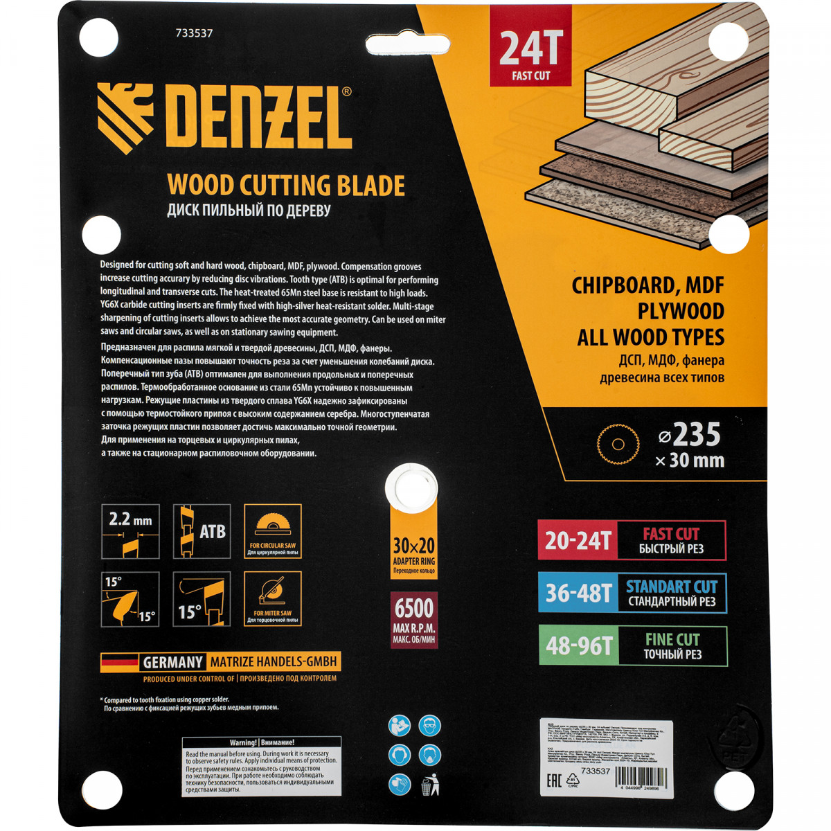 Пильный диск Denzel 733537 диаметром 235 x 30 мм, с 24 зубьями, предназначен для продольного и поперечного распила твердой и мягкой древесины, фанеры, МДФ, ДСП. 24 зуба типа ATB с режущими пластинами оптимальной геометрии обеспечивают быстрый рез. Режущие пластины из твердого сплава YG6X сохраняют рабочие свойства при интенсивном использовании. Диск устанавливается на циркулярную, торцовочную пилу или на распиловочный станок. В комплект поставки входит переходное кольцо с 30 на 20 мм, что позволяет изменить посадочный размер и расширяет возможности использования диска.