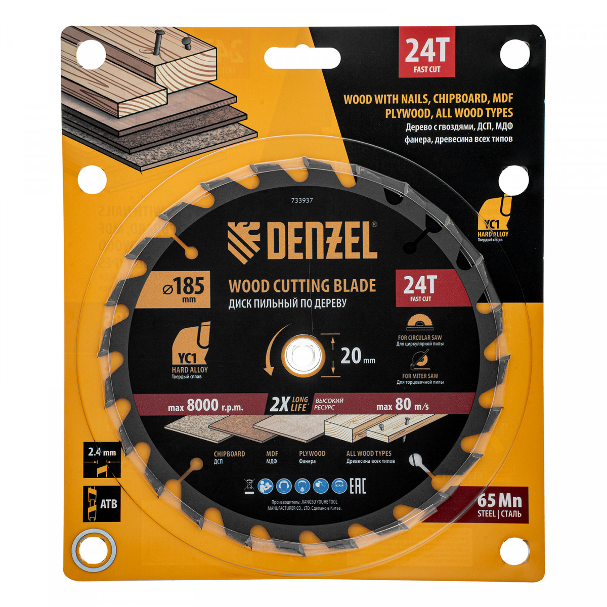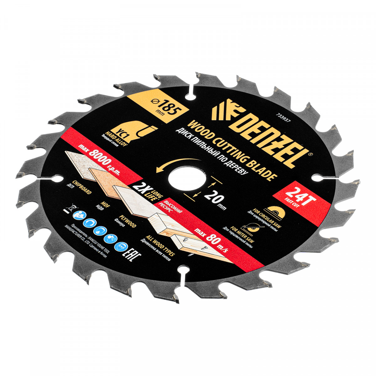 Пильный диск Denzel 733937 диаметром 185 x 20 мм, с 24 зубьями типа ATB, предназначен для быстрого продольного и поперечного распиливания древесины всех типов, в том числе с гвоздями и остатками бетона, а также ДСП, МДФ, фанеры. Режущие пластины из твердого сплава YC1, прошедшие многоступенчатую заточку, позволяют успешно справляться с прочными материалами. Диск устанавливается на циркулярную, торцовочную пилу или на распиловочный станок. В комплект поставки входит переходное кольцо 20/16 мм, позволяющее изменить посадочный диаметр при необходимости.
