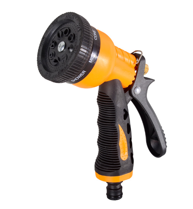 Пистолет-распылитель применяется для полива растений на дачном участке.Оснащен регулировкой интенсивности распыления в 8 режимах от слабой до жесткой струи для эффективного полива участка.Эргономичная рукоятка с обрезиненным покрытием обеспечивает крепкий хват без скольжения руки.Корпус из пластика отличается прочностью и устойчивостью к механическим повреждениям.