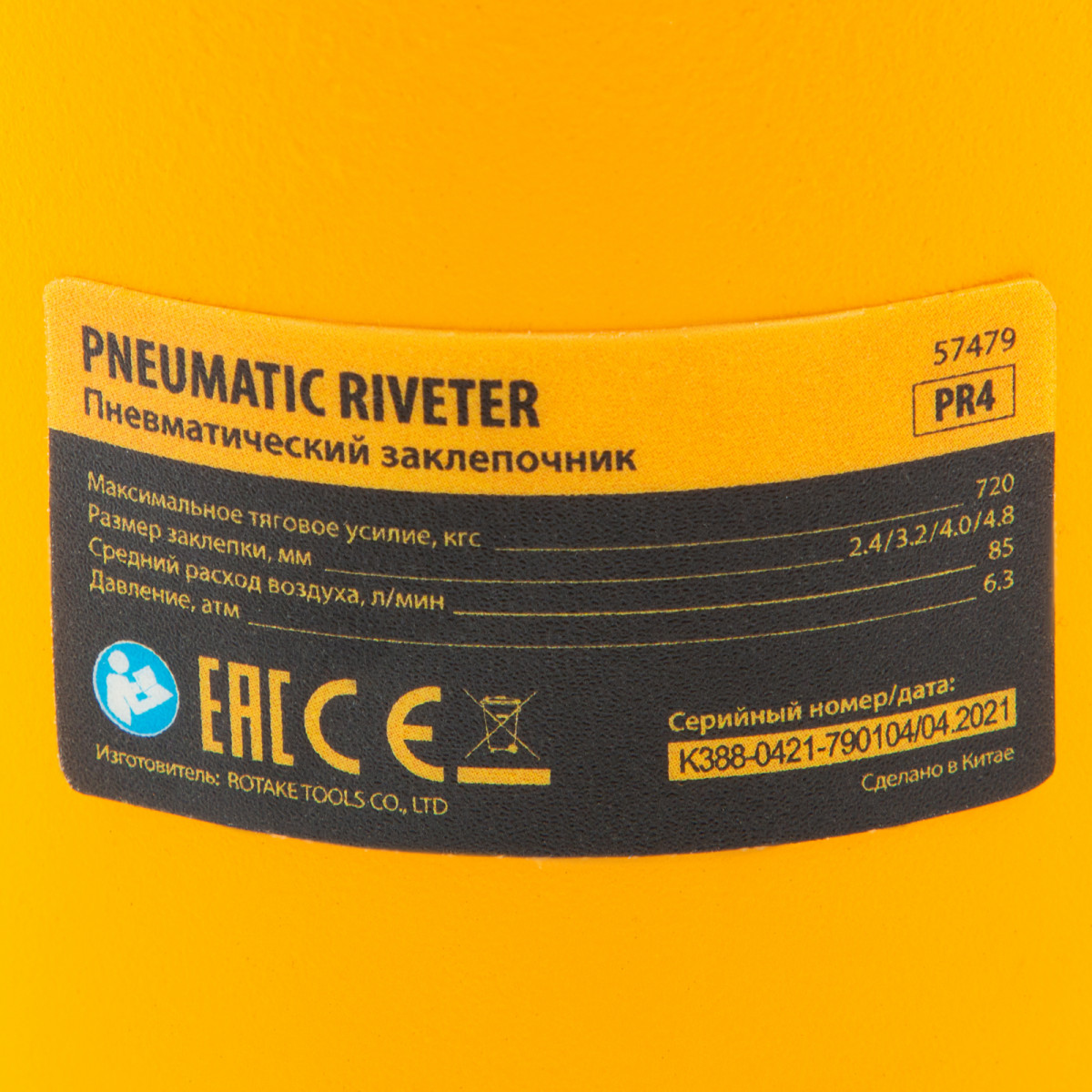 Пневматический заклепочник Denzel PR4 57479 значительно упрощает работу в автосервисах, домашних мастерских, на малых предприятиях и на ремонтных площадках. С его помощью можно без усилий скрепить листовой, профильный и панельный материал из пластика и металла.,Пистолет для вытяжных заклепок работает под давлением 6,3 АТМ и расходует всего 85 литров воздуха в минуту, поэтому для него подойдет компрессор средней мощности. В качестве оснастки используются заклепки размером 2,4-4,8 мм. В комплект поставки входит 4 насадки под заклепки размерами 2,4 мм, 3,2 мм, 4 мм и 4,8 мм.