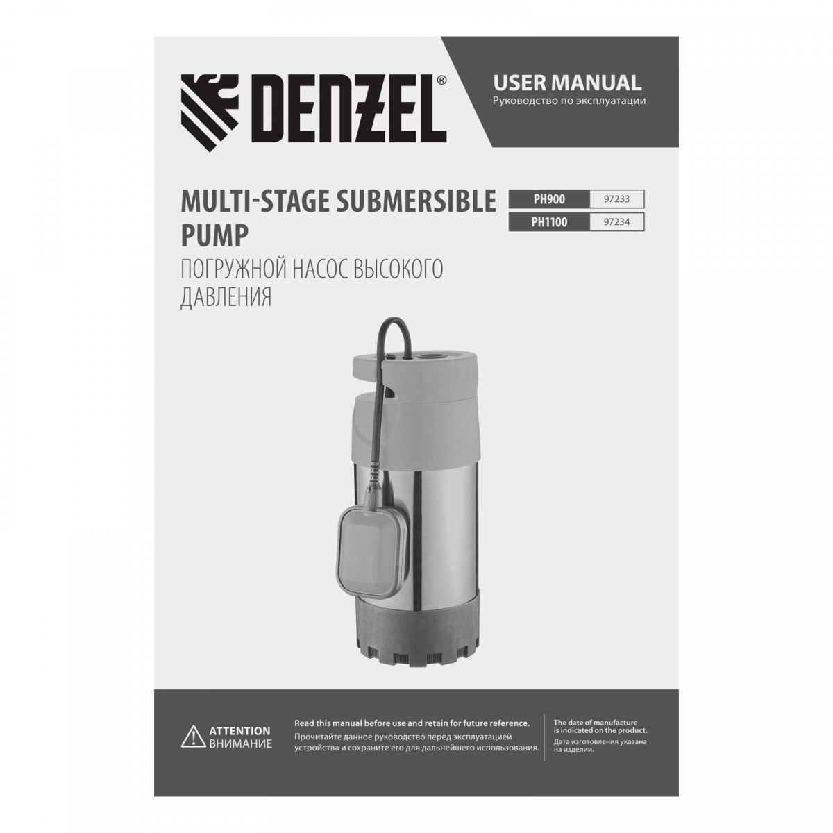Погружной насос высокого давления PH1100, 1100Вт, подъем 40м, 5500 л/ч Denzel