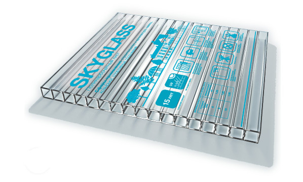 Сотовый поликарбонат SKYGLASS — представляет марку, отличающуюся оптимальным соотношением цены и качества, с защитой от UV-излучения 30 мкм.