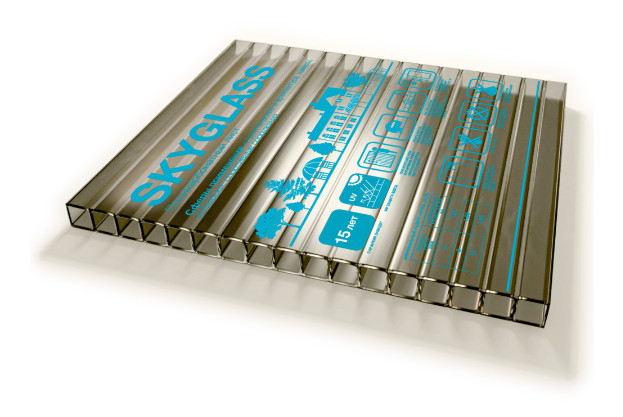 Сотовый поликарбонат SKYGLASS — представляет марку, отличающуюся оптимальным соотношением цены и качества, с защитой от UV-излучения 30 мкм.
