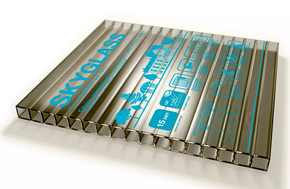 Сотовый поликарбонат SKYGLASS — представляет марку, отличающуюся оптимальным соотношением цены и качества, с защитой от UV-излучения 30 мкм.