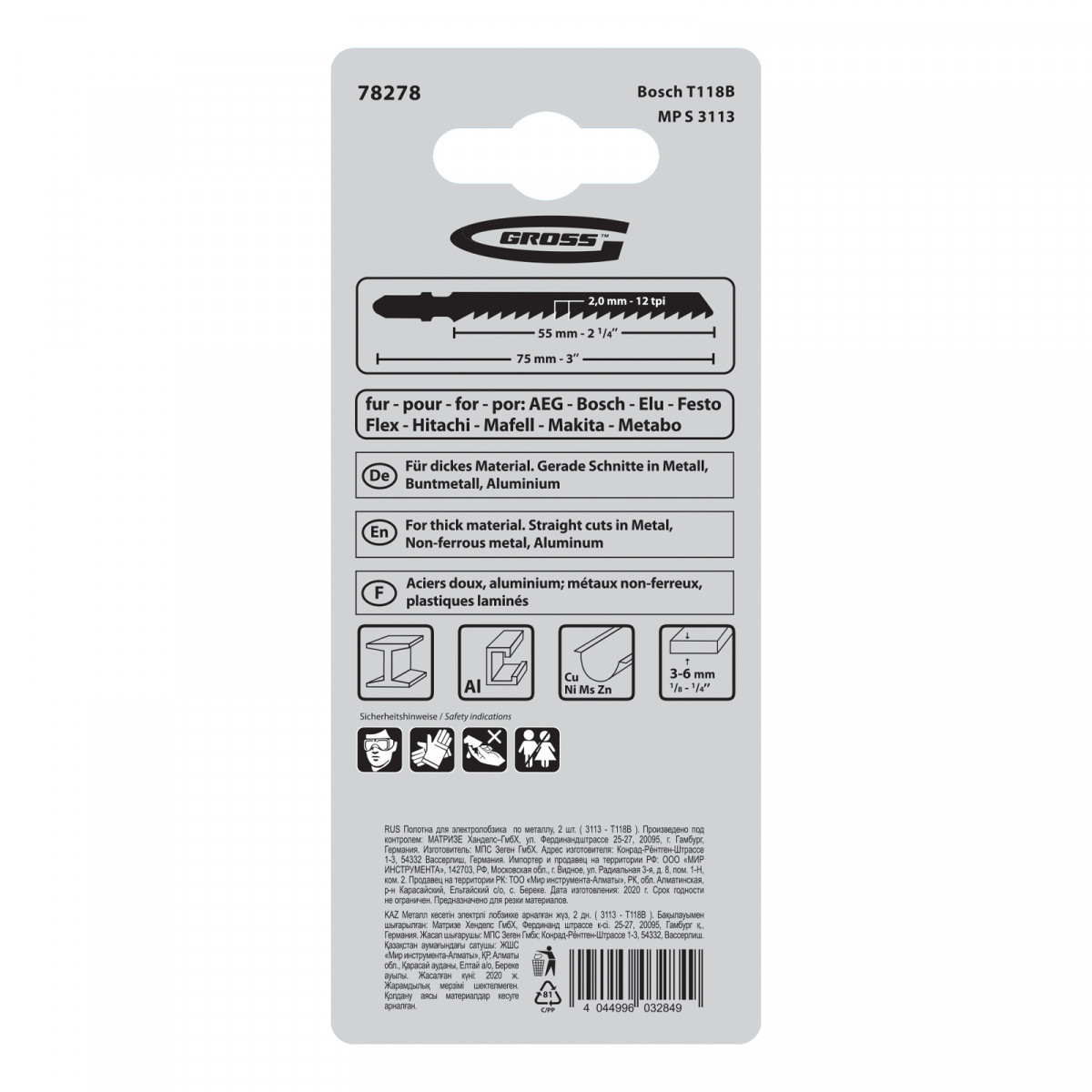Полотна по металлу 3113-T118B Gross 78278, 2 шт. в упаковке, — сменные режущие элементы, подходящие для большинства современных электролобзиков. Производят прямой рез металлических, стальных заготовок, листового железа, изделий из стеклопластика, текстолита и прочих композитных материалов толщиной 3-6 мм. Предназначены для профессионального применения во время ремонтных и строительных работ.