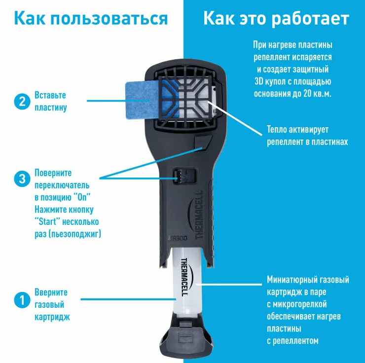 Противомоскитный прибор Thermacell работает по принципу фумигации – в воздух испаряется репеллент, который отпугивает комаров на площади до 20 кв.м. Прибор не зависит от электрической розетки – его можно брать на охоту, рыбалку, дачу, кемпинг, пикник на природе. Во время работы он не выделяет запаха, что очень важно, например, на охоте и рыбалке – зверь или рыба его не учуют. Прочный корпус не боится падений и механического воздействия. А в обращении модель настолько проста, что с ней справится даже ребенок. Кстати, для детей Thermacell безвреден – так же, как и для аллергиков. Расходные материалы – важная часть защиты от комаров. Одной пластины с репеллентом хватает на четыре часа «бескомарья», одного бутанового картриджа, который нагревает пластину – на 12. Причем, и пластины, и картридж входят в комплект поставки. Эффективность и безопасность Thermacell высоко оценили специалисты американского агентства по охране окружающей среды (ЕРА).